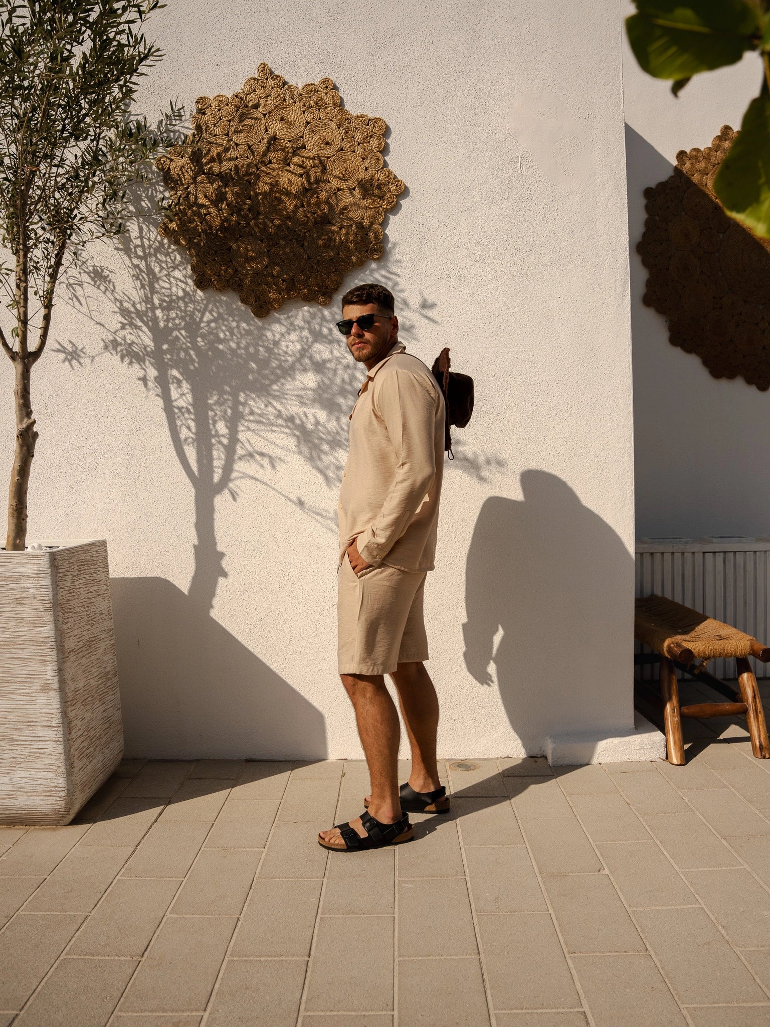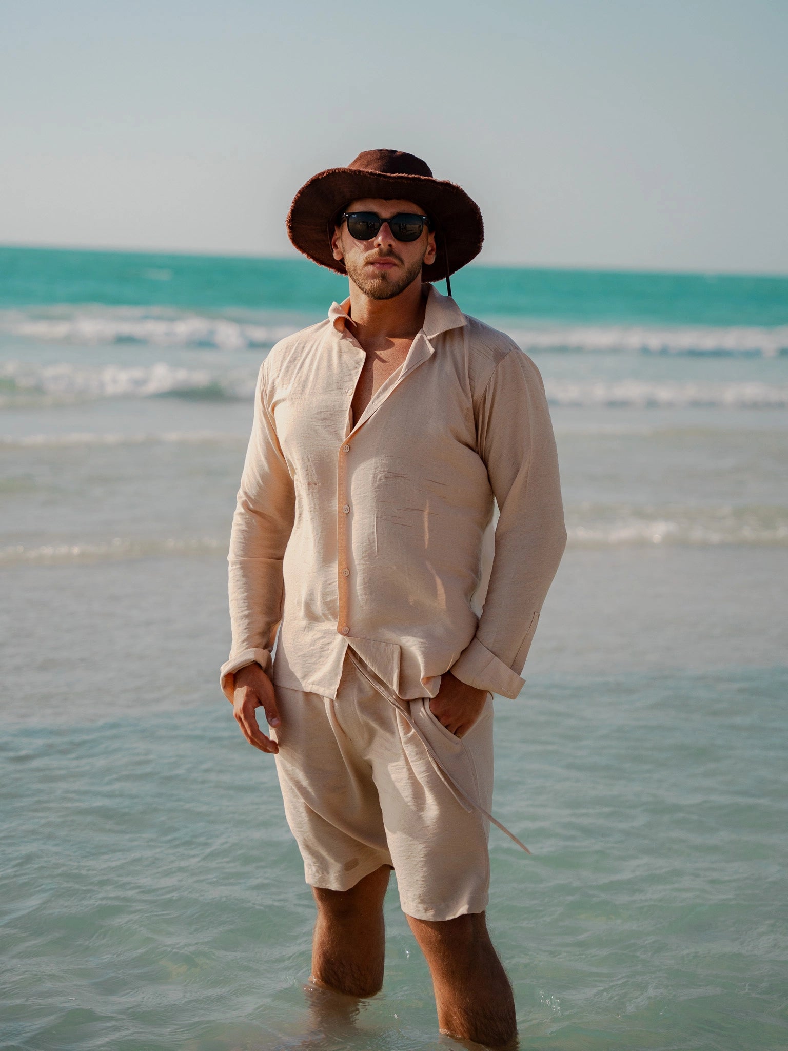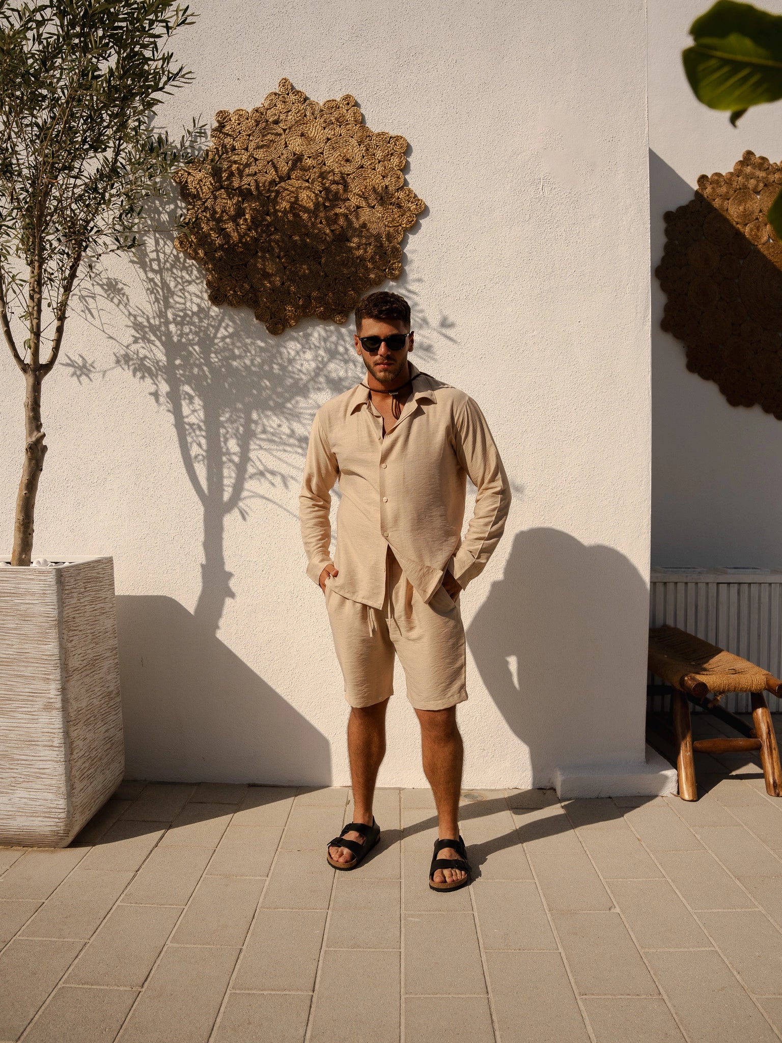 Presenting the Breeze Linen Set, the ultimate level of stylish comfort for guys. This outfit, which is made of fine linen, includes fitted shorts and a long-sleeve button-up shirt in a sophisticated and adaptable beige color. This set is a wardrobe must since it seamlessly blends style and comfort, making it appropriate for any occasion.
