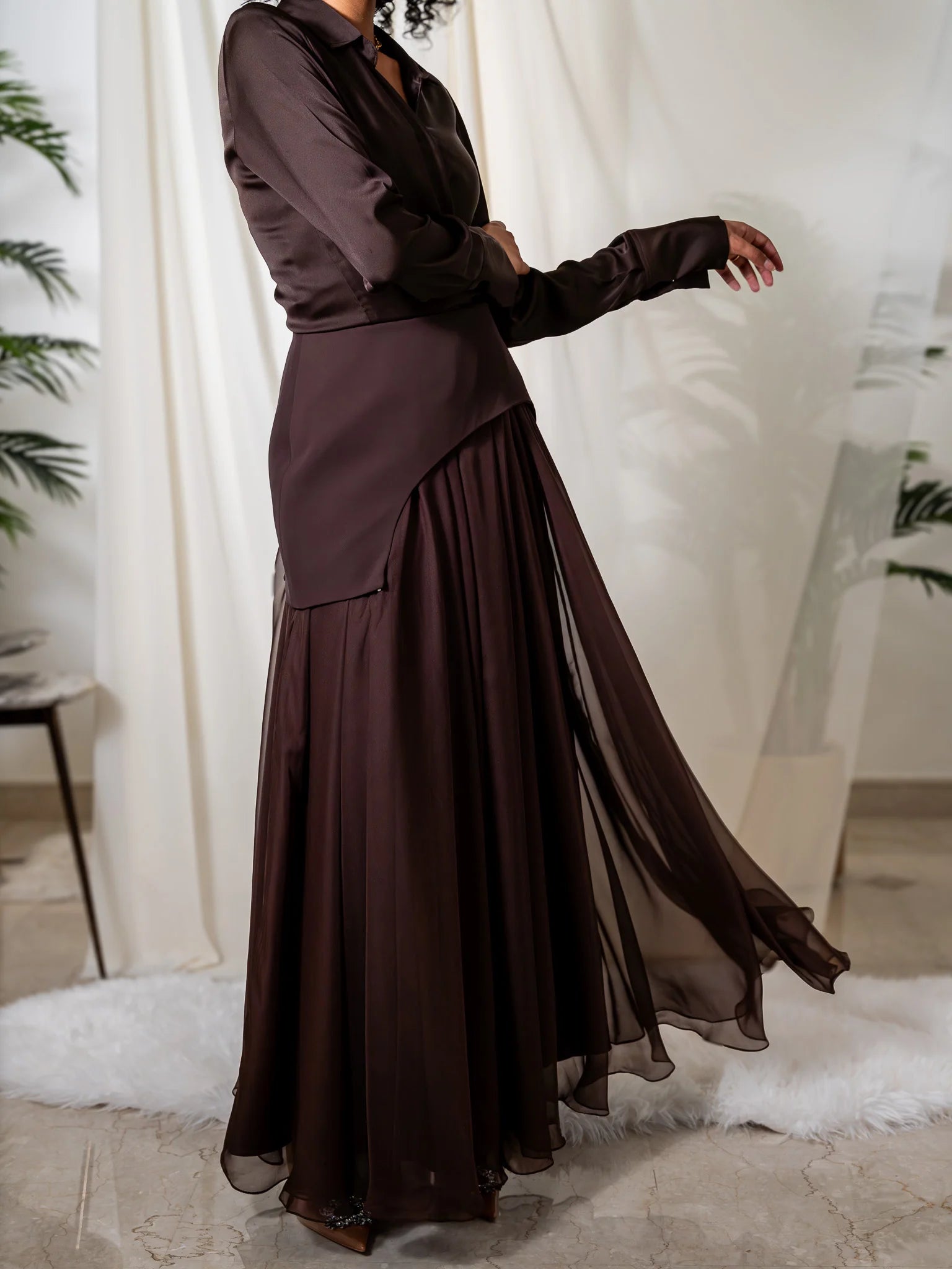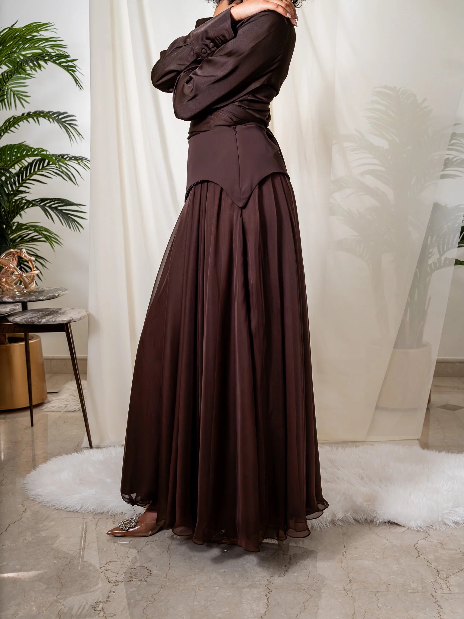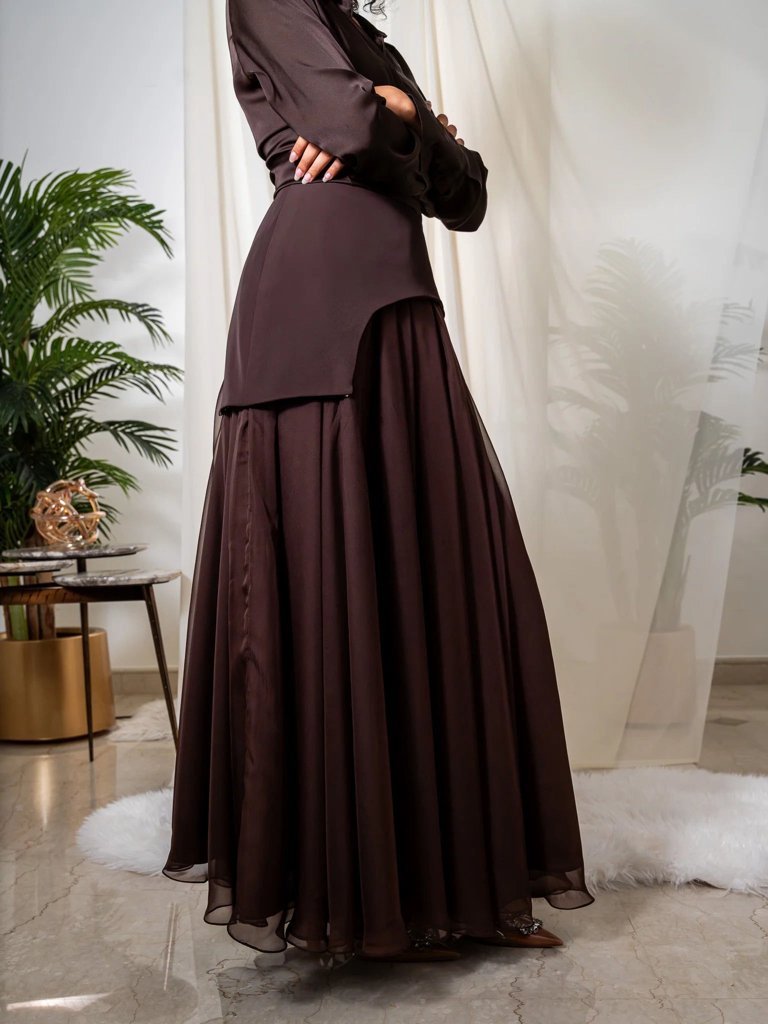 - Introducing the Bunni Dream Skirt, a captivating addition to your wardrobe. Available in our signature Brown color. This floor length skirt features a special cut at the waist, adding a stylish touch to its silhouette. Crafted with a full circle design, it gracefully flows with your movements.