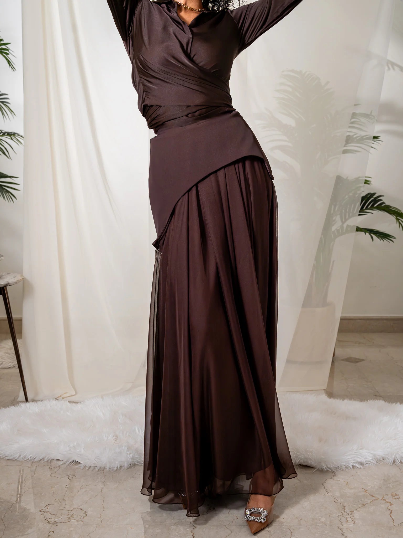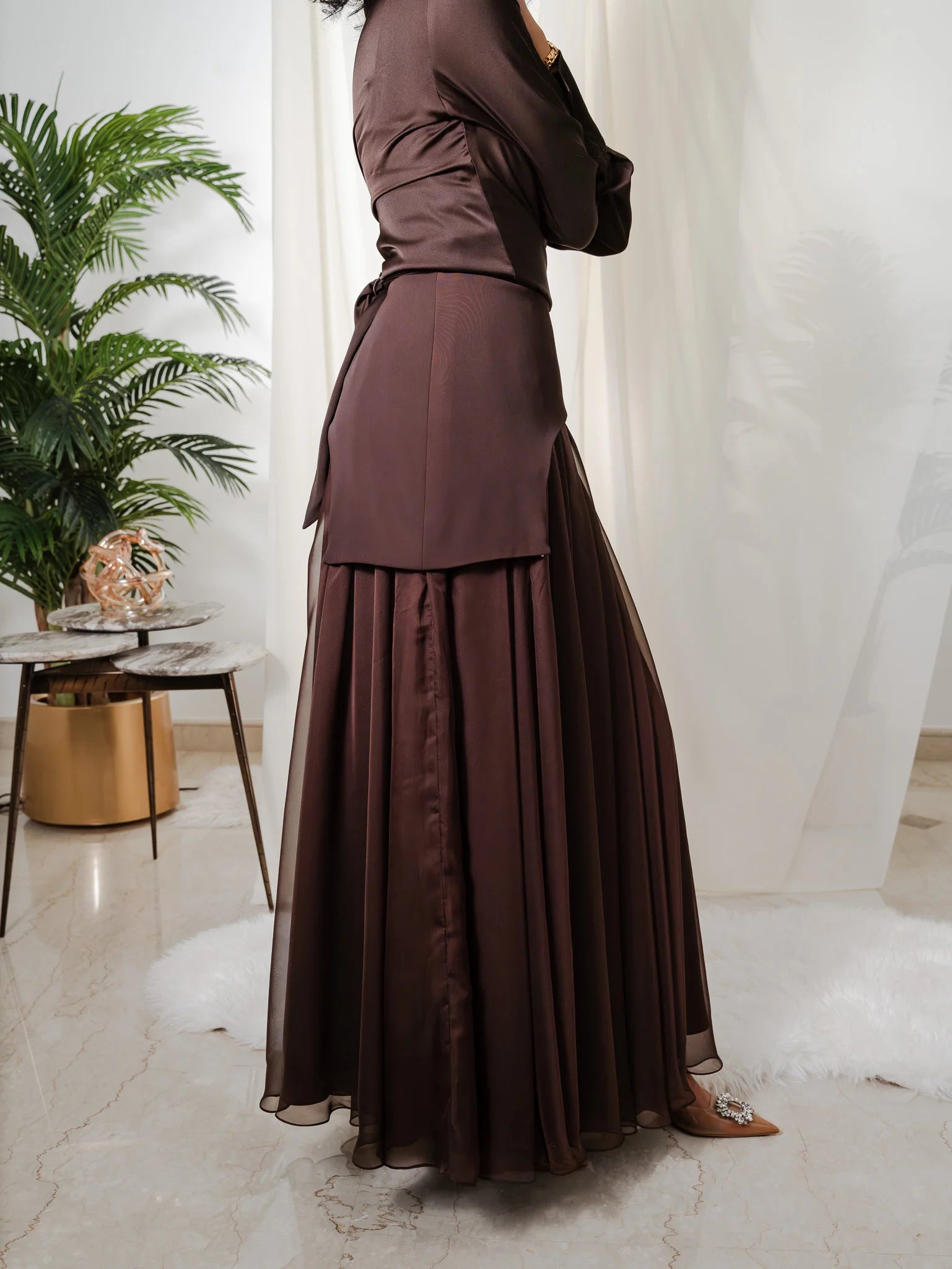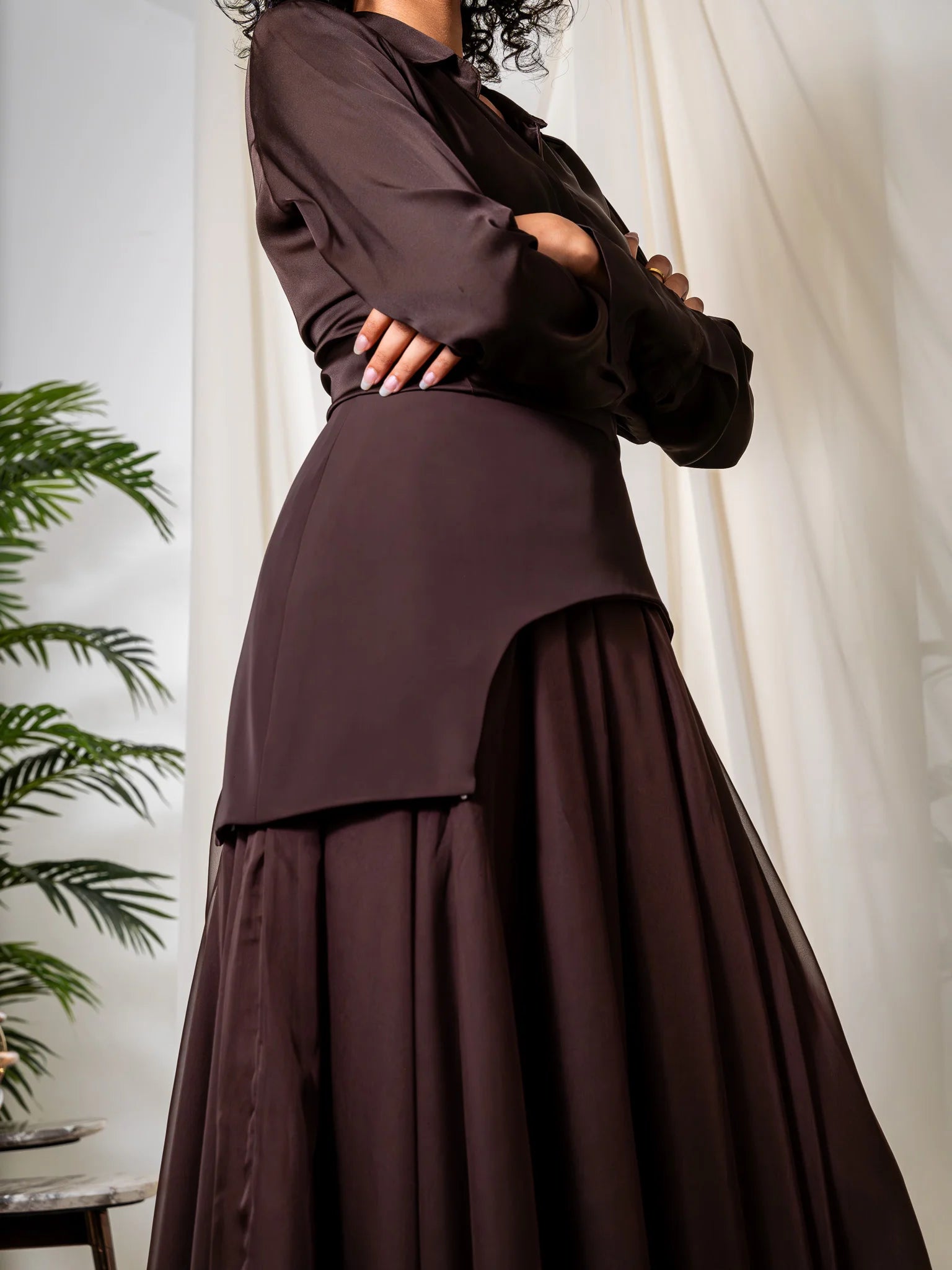 - Introducing the Bunni Dream Skirt, a captivating addition to your wardrobe. Available in our signature Brown color. This floor length skirt features a special cut at the waist, adding a stylish touch to its silhouette. Crafted with a full circle design, it gracefully flows with your movements.