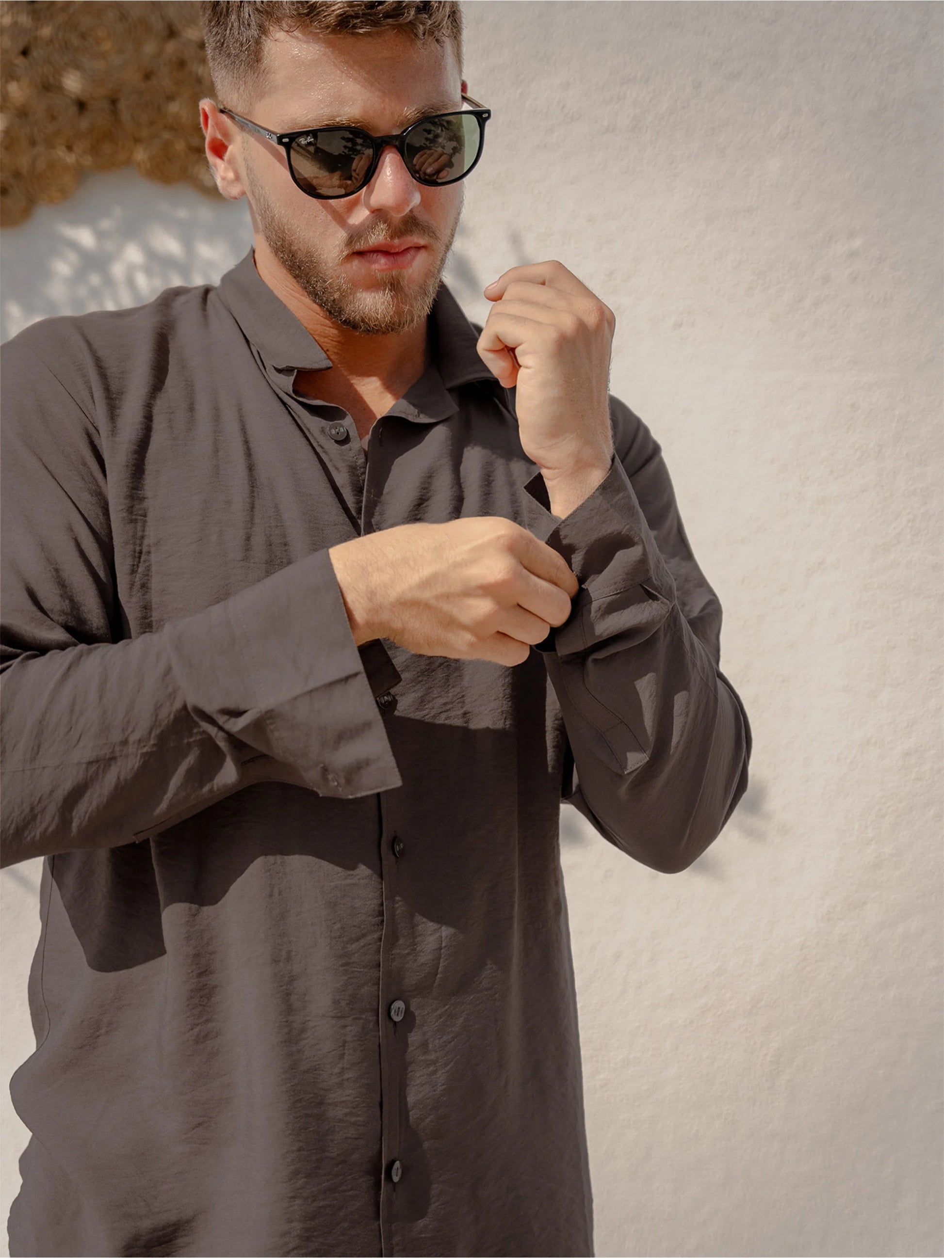 Presenting the ultimate in classy comfort for men: the Espresso Linen Set. This combination, which is made of fine linen, includes a long-sleeve button-up shirt in a deep, adaptable brown color and fitted shorts. This set is a wardrobe must since it seamlessly blends style and comfort, making it appropriate for any occasion.