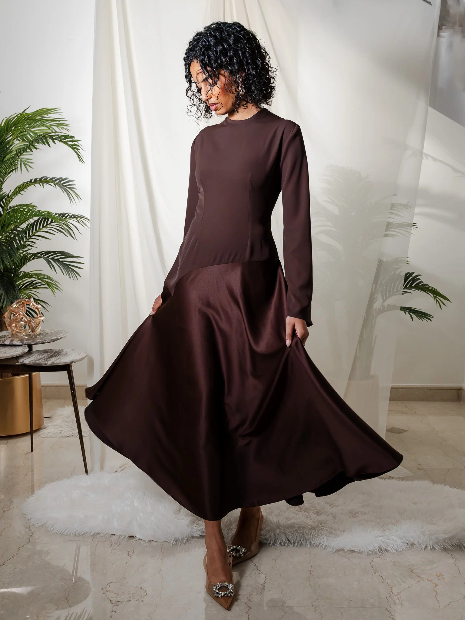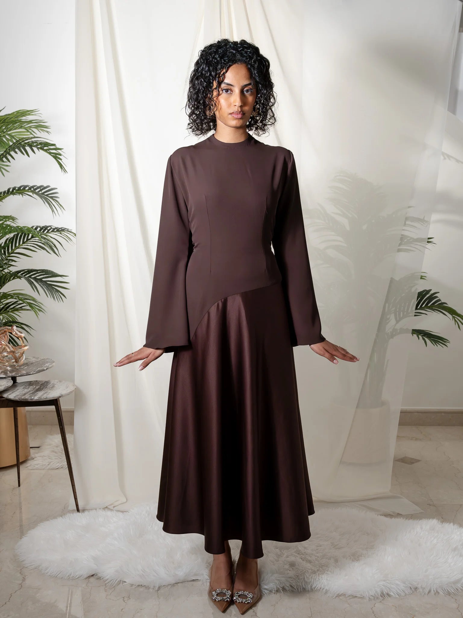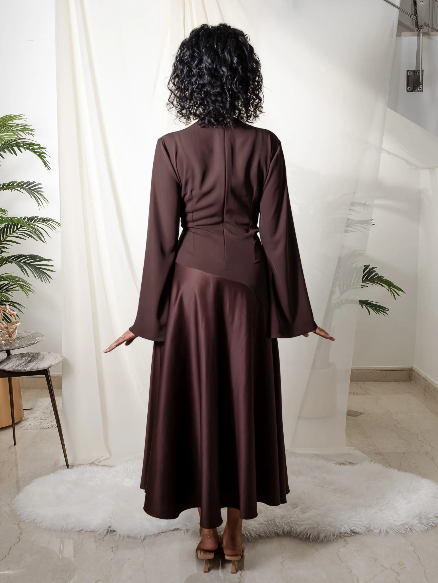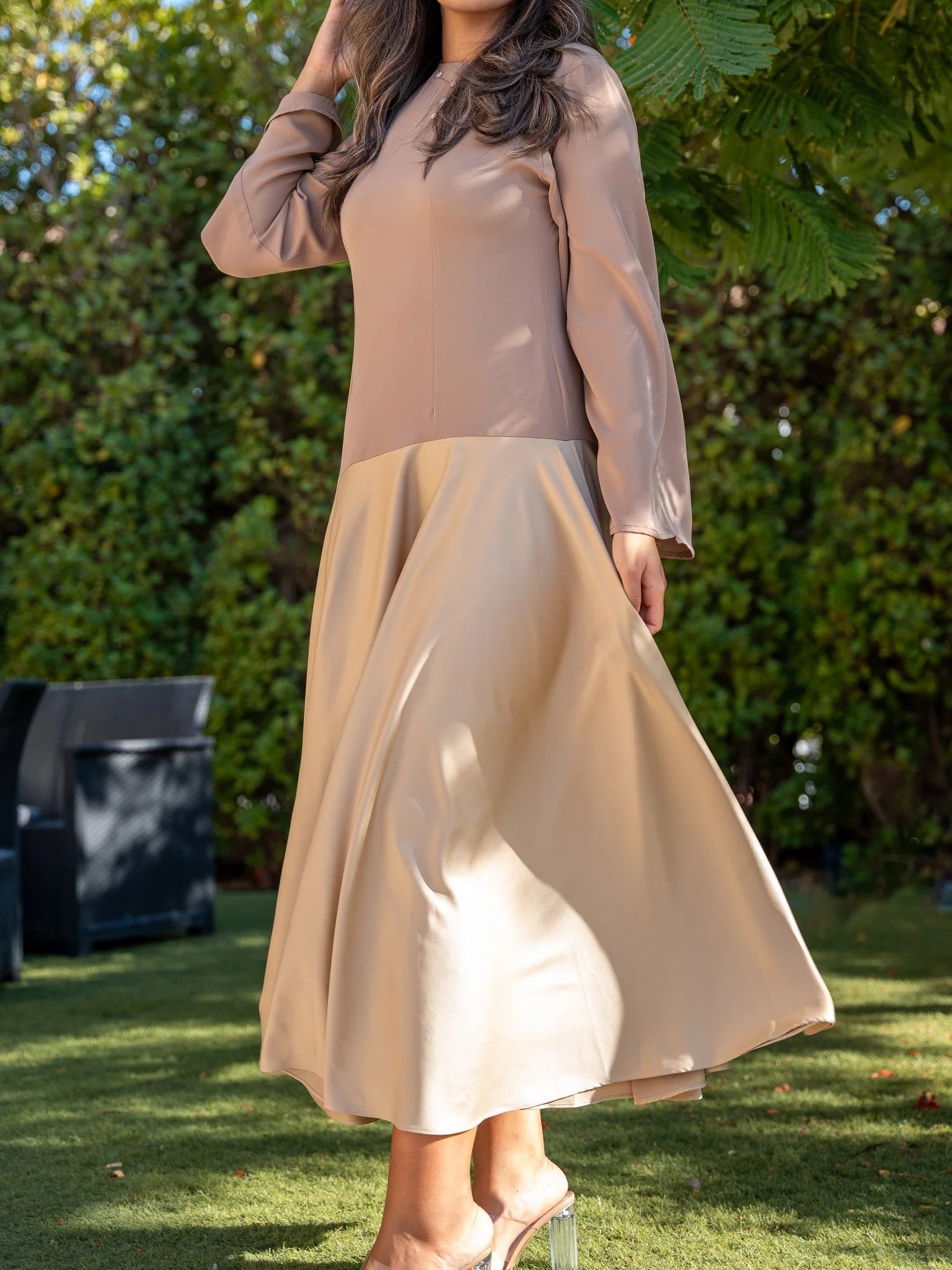 - Crafted from high-quality sustainable materials, our dress combines luxury with environmental responsibility. The shiny material adds a subtle shimmer, elevating its allure.
