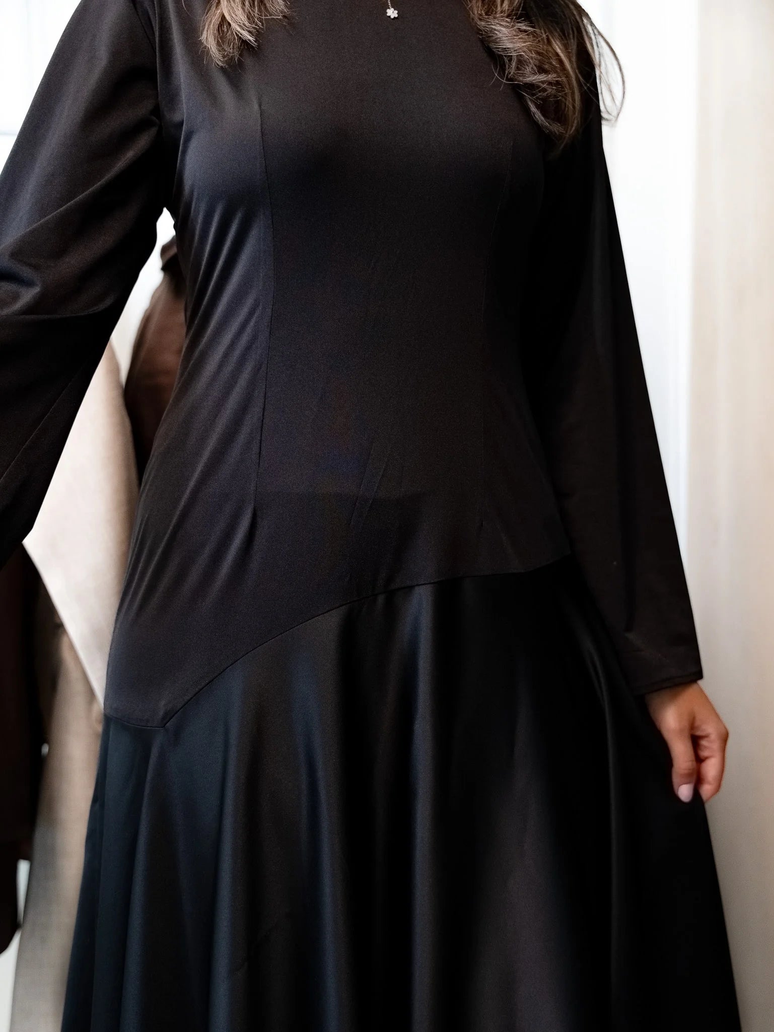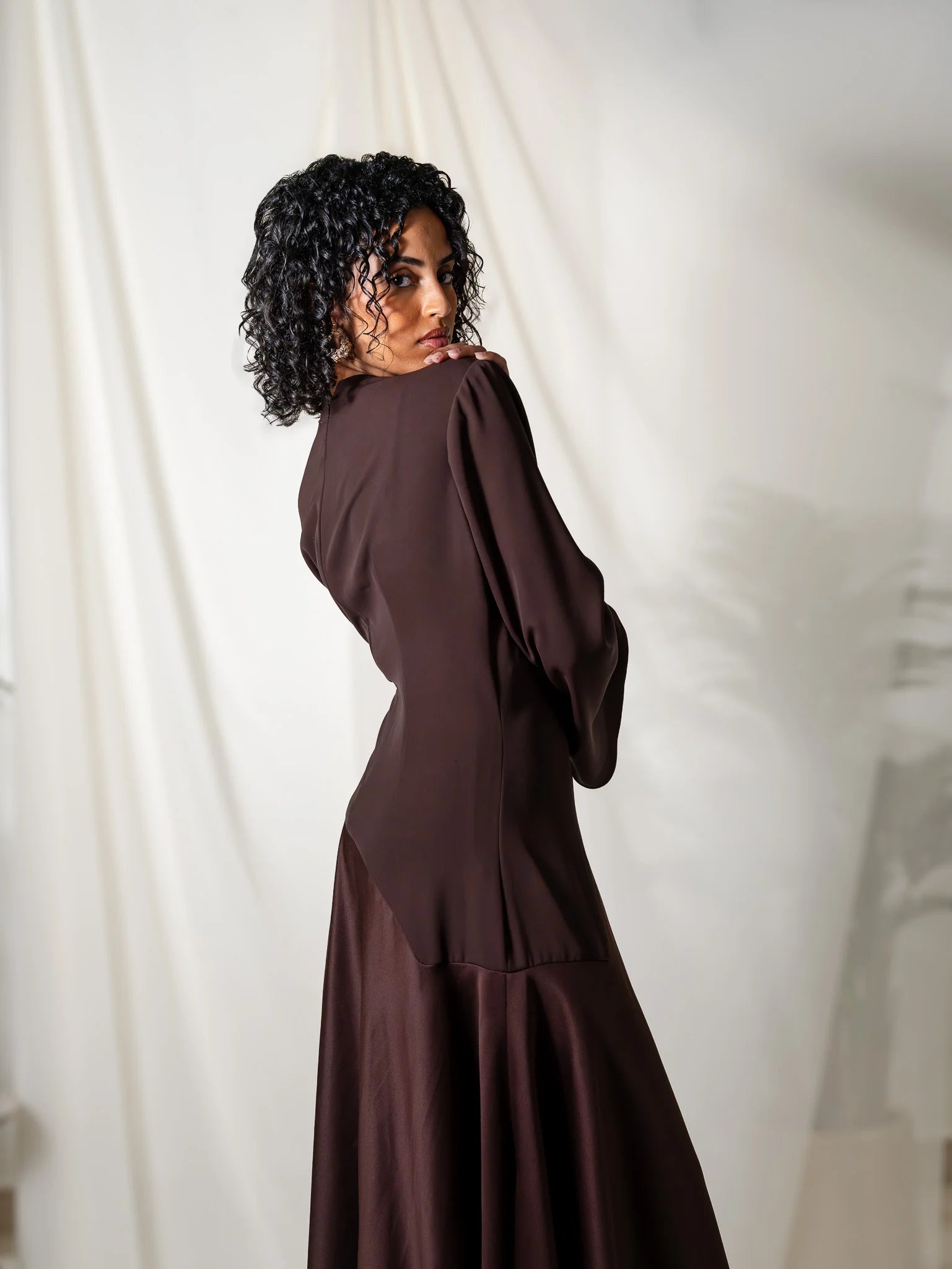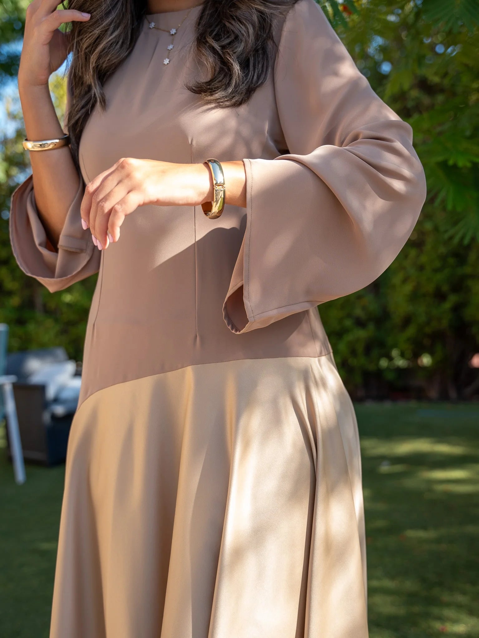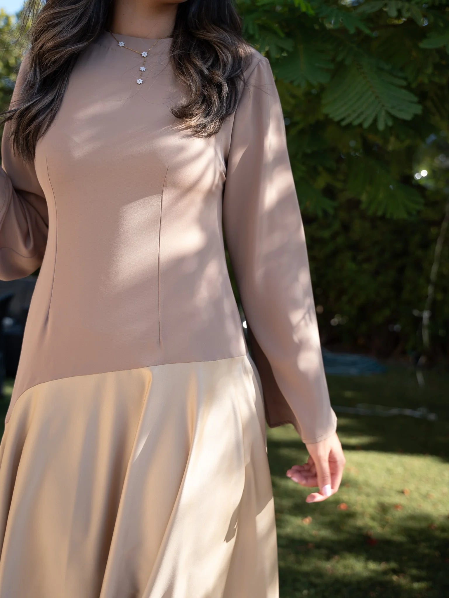 - Crafted from high-quality sustainable materials, our dress combines luxury with environmental responsibility. The shiny material adds a subtle shimmer, elevating its allure.
