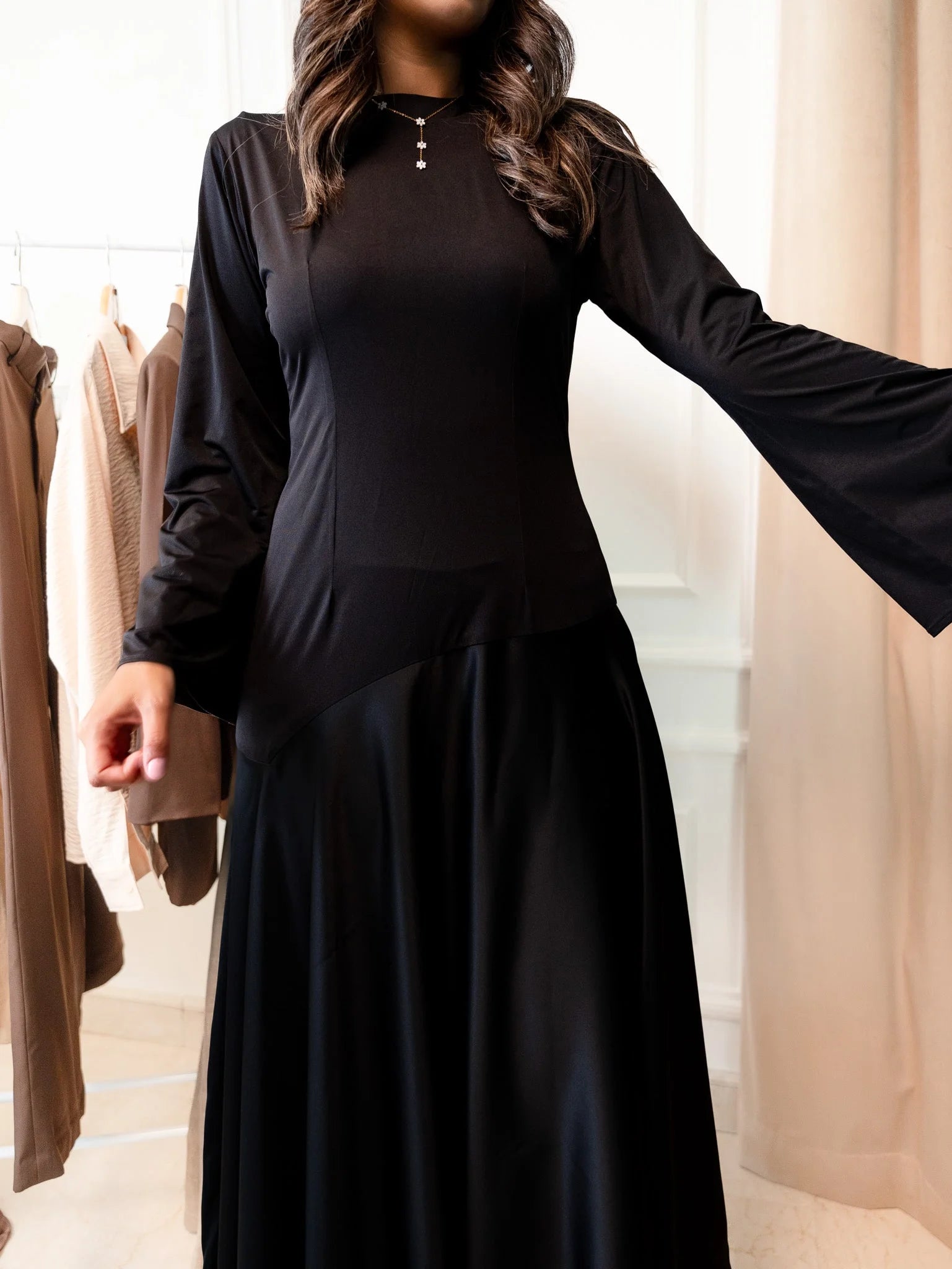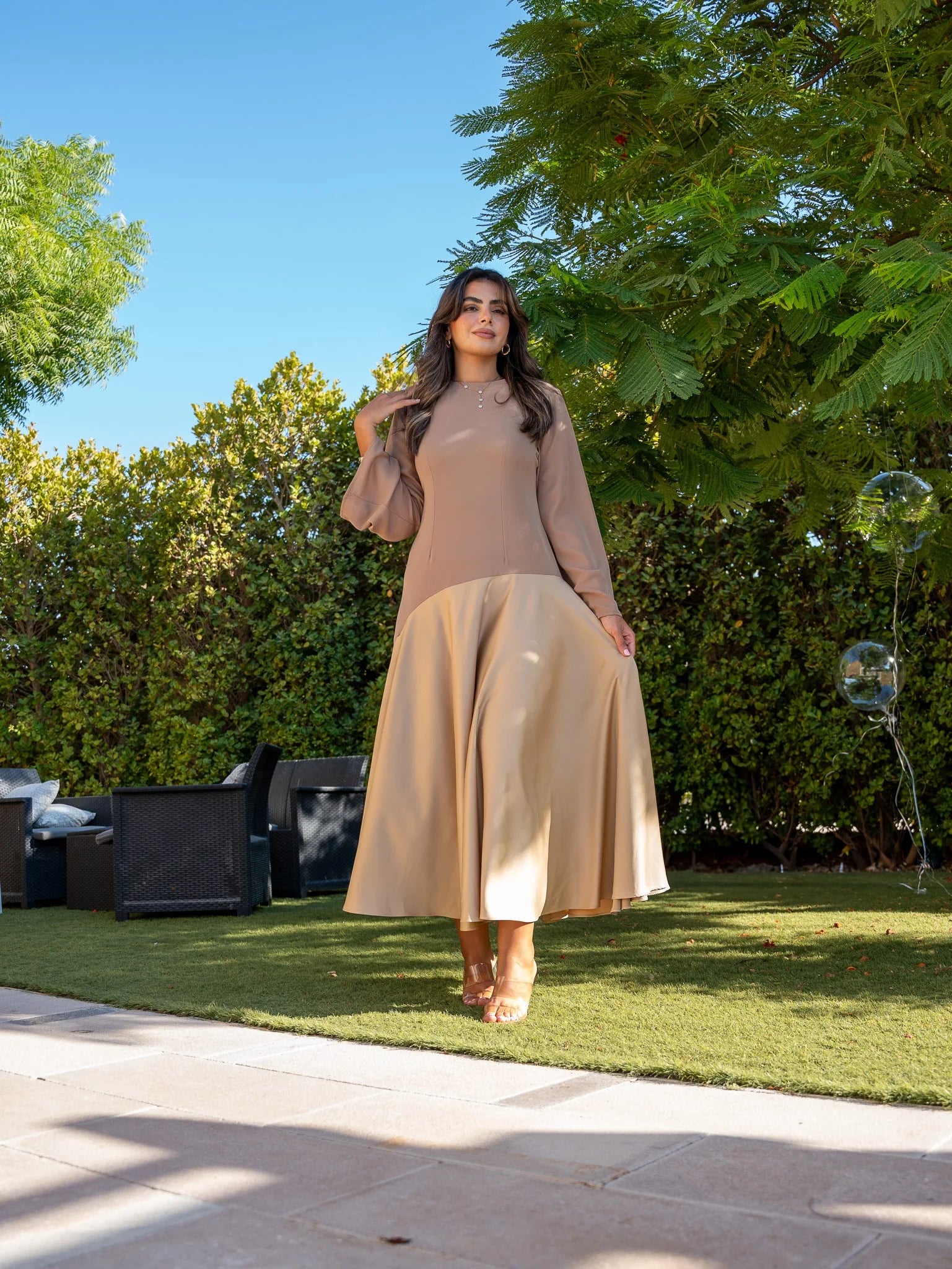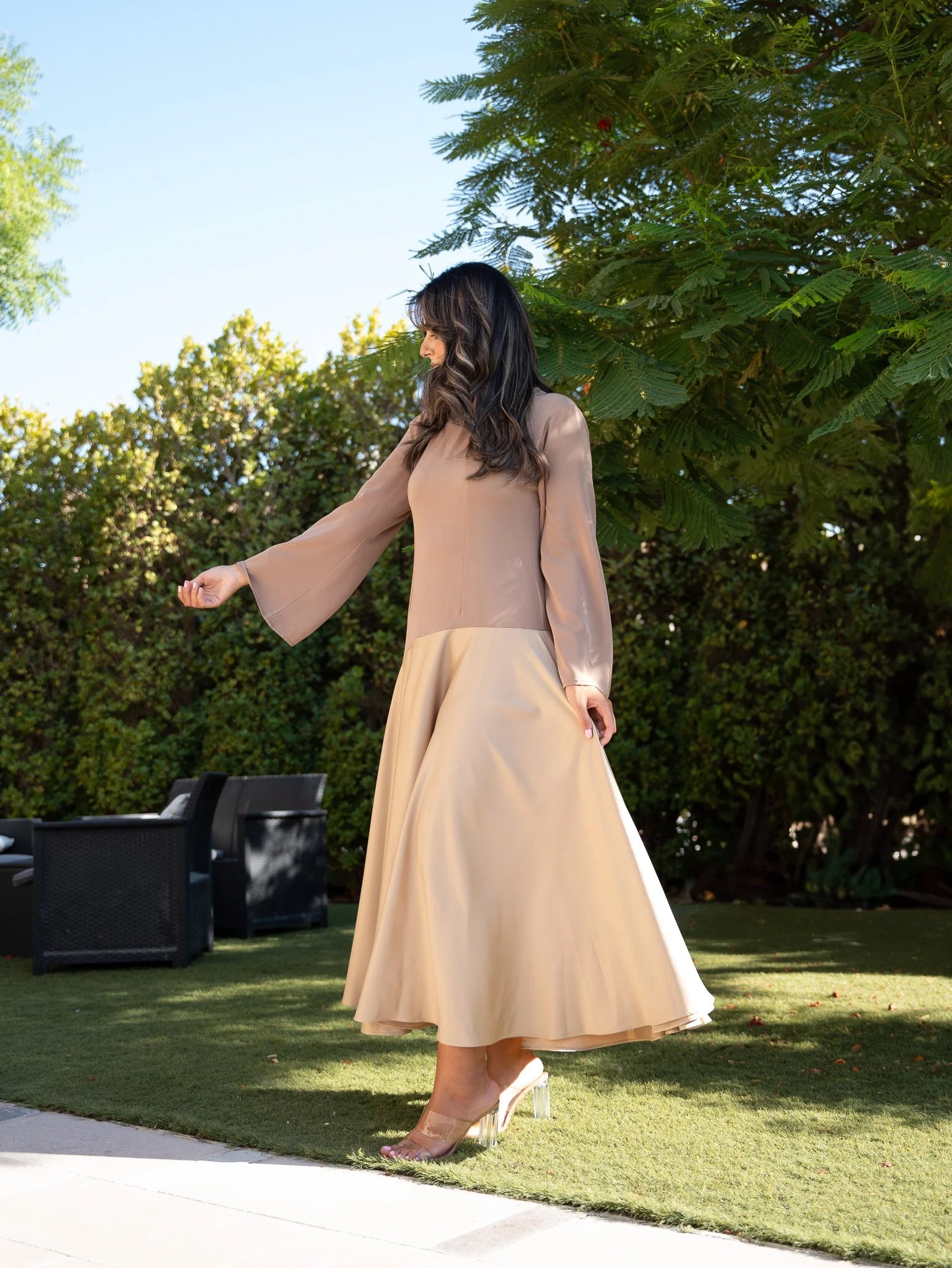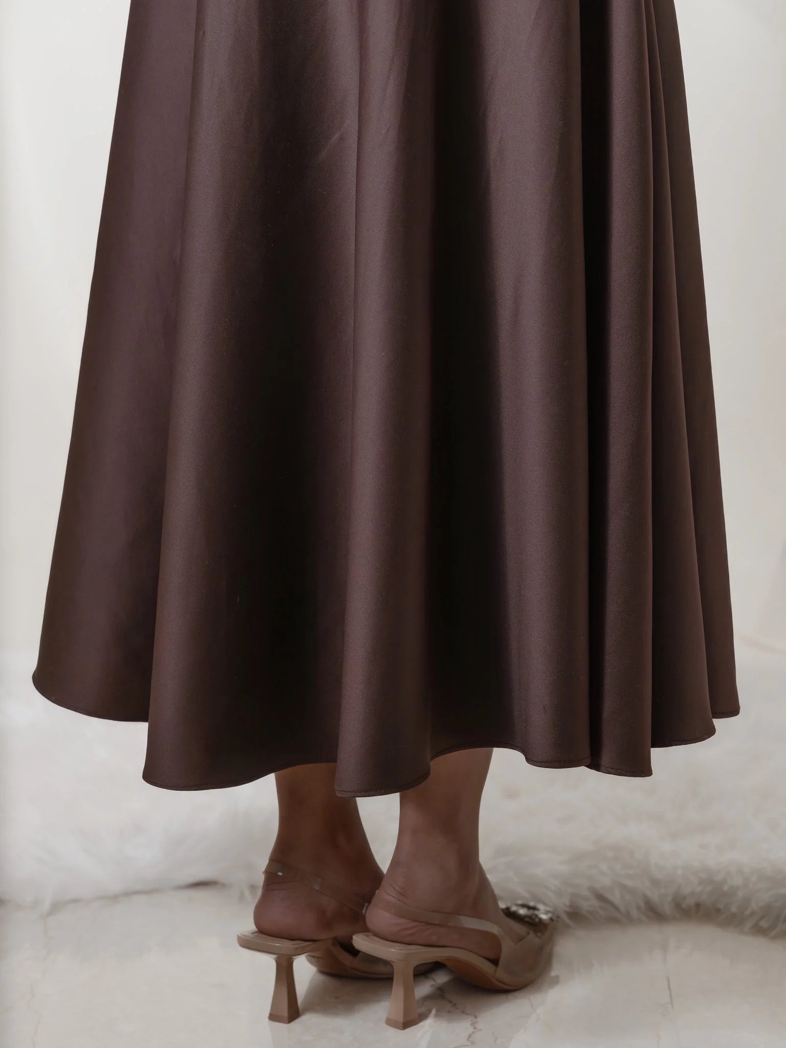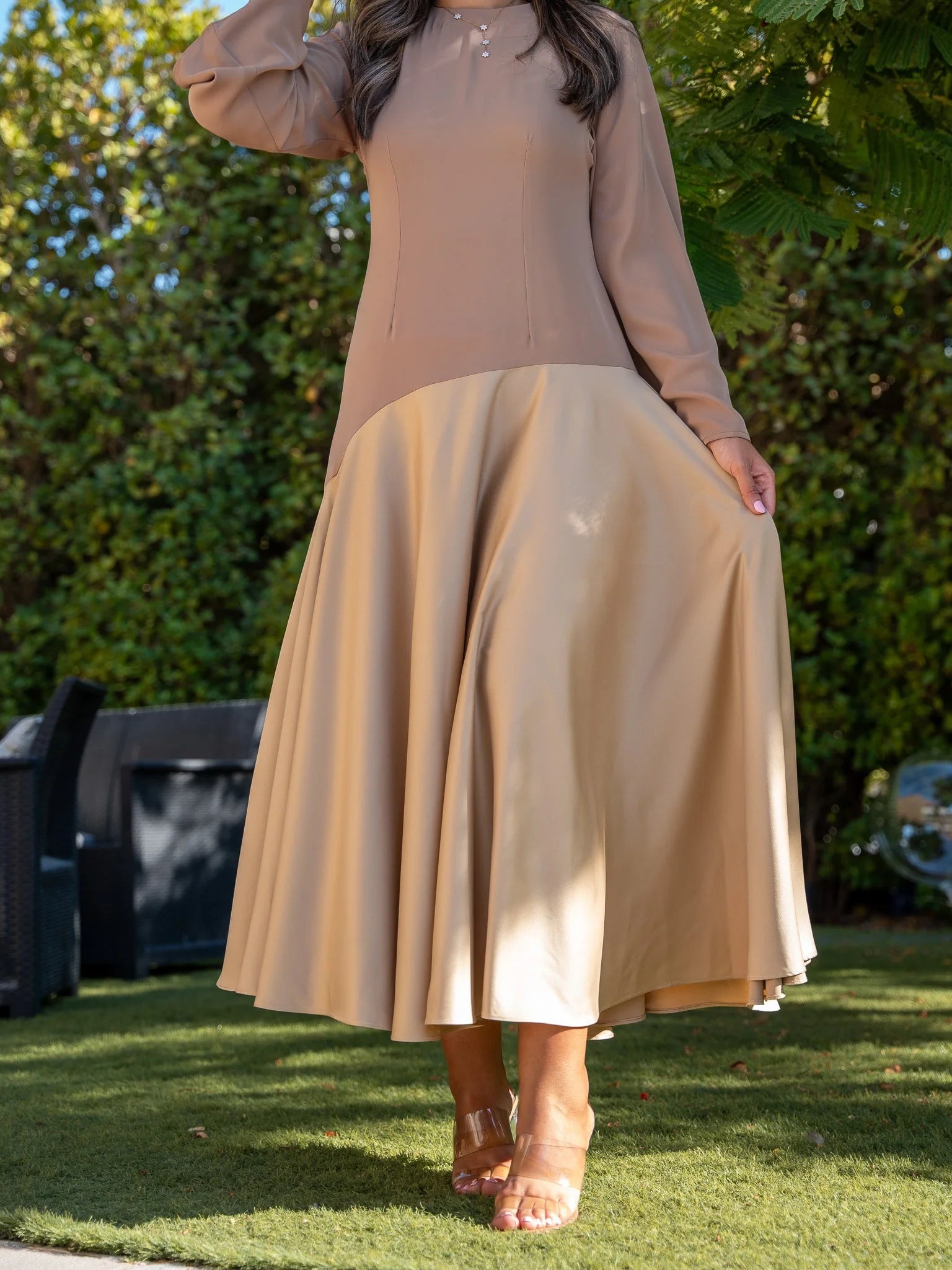 - Introducing the Oasis Whisper Dress – an ankle-length masterpiece designed to captivate with every step. This dress features a unique uppercut crafted from a softer material, ensuring unparalleled comfort without compromising on style. The full circle skirt adds a touch of grace and movement to your ensemble, making it perfect for any occasion.