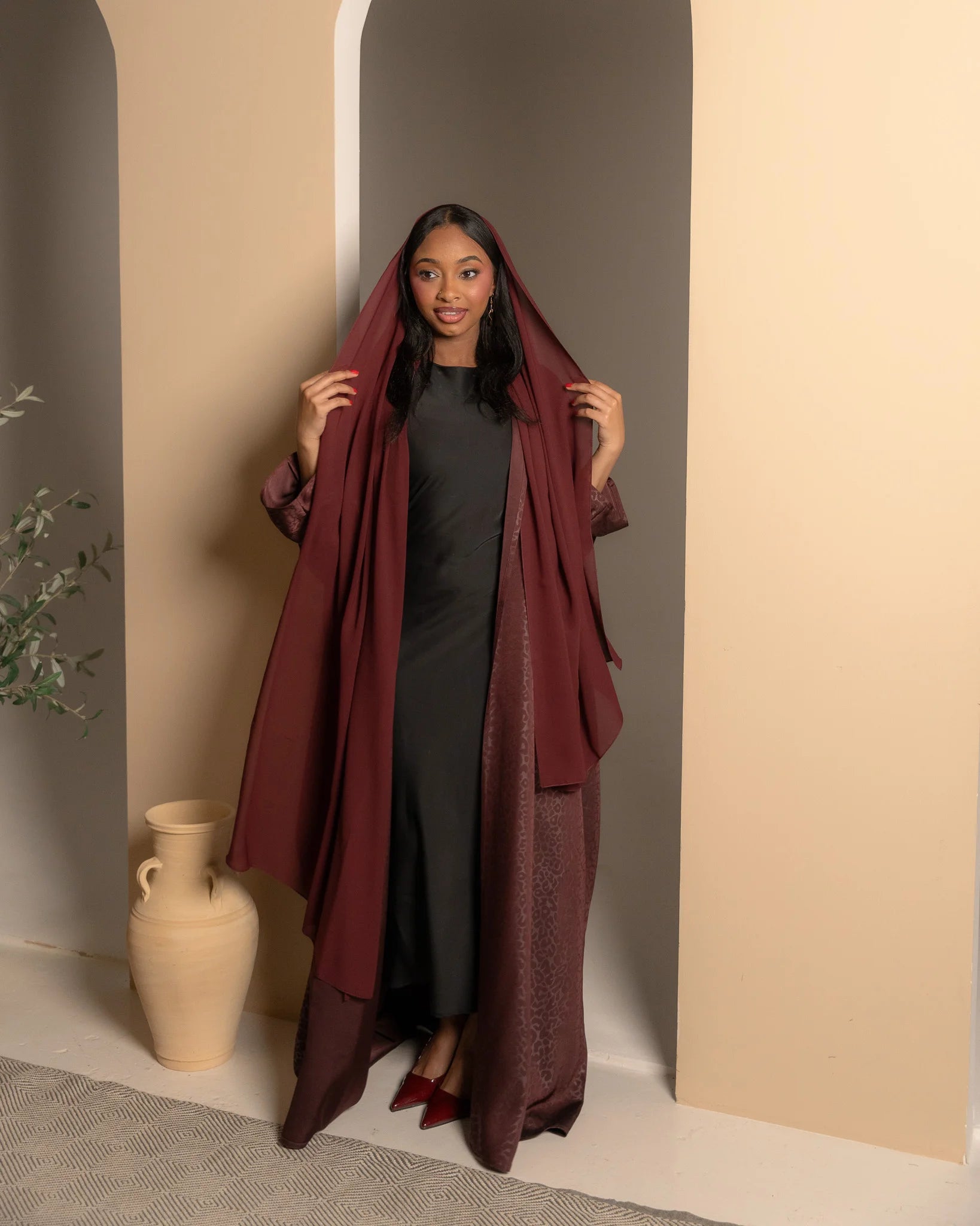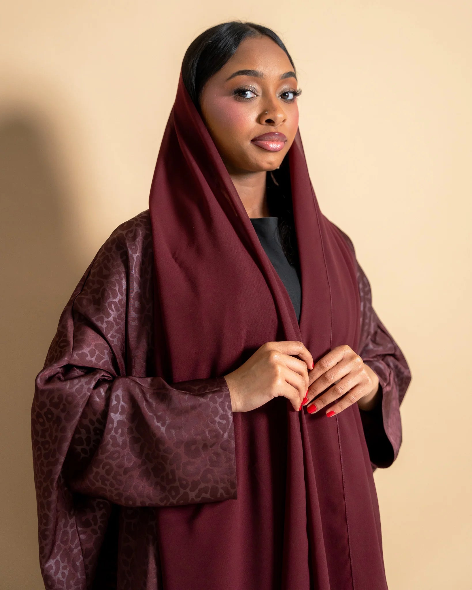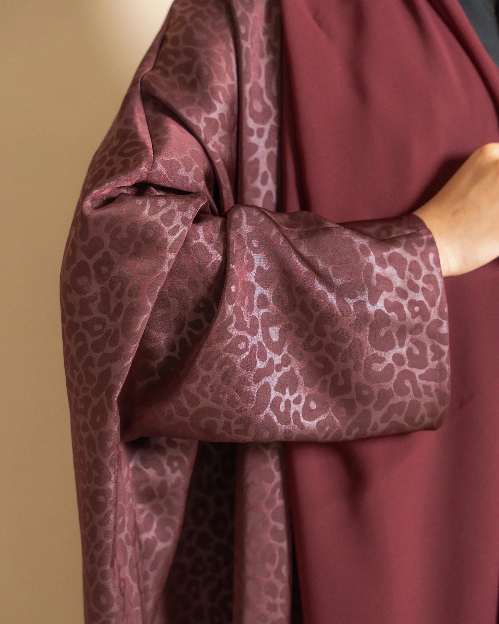 Unleash your bold side with the Leopard Red Satin Abaya, blending fierce prints with luxurious sheen. Crafted from silky satin with a striking red hue and leopard-patterned accents, this abaya is designed for confidence and elegance.