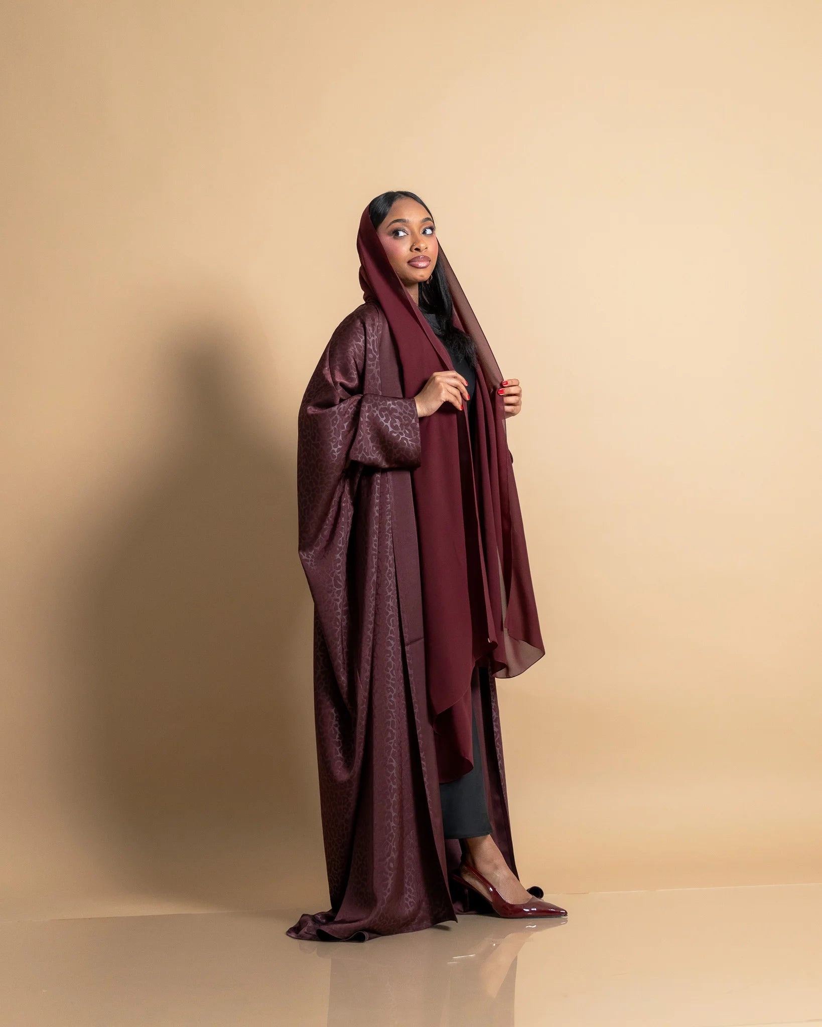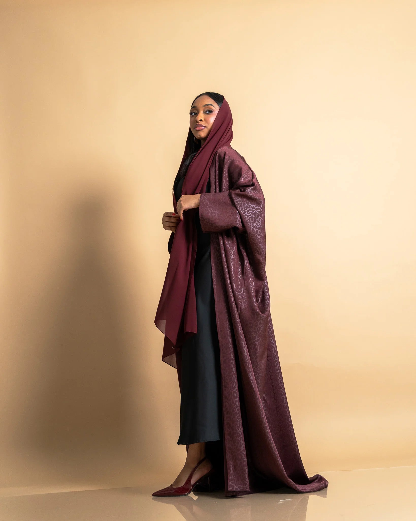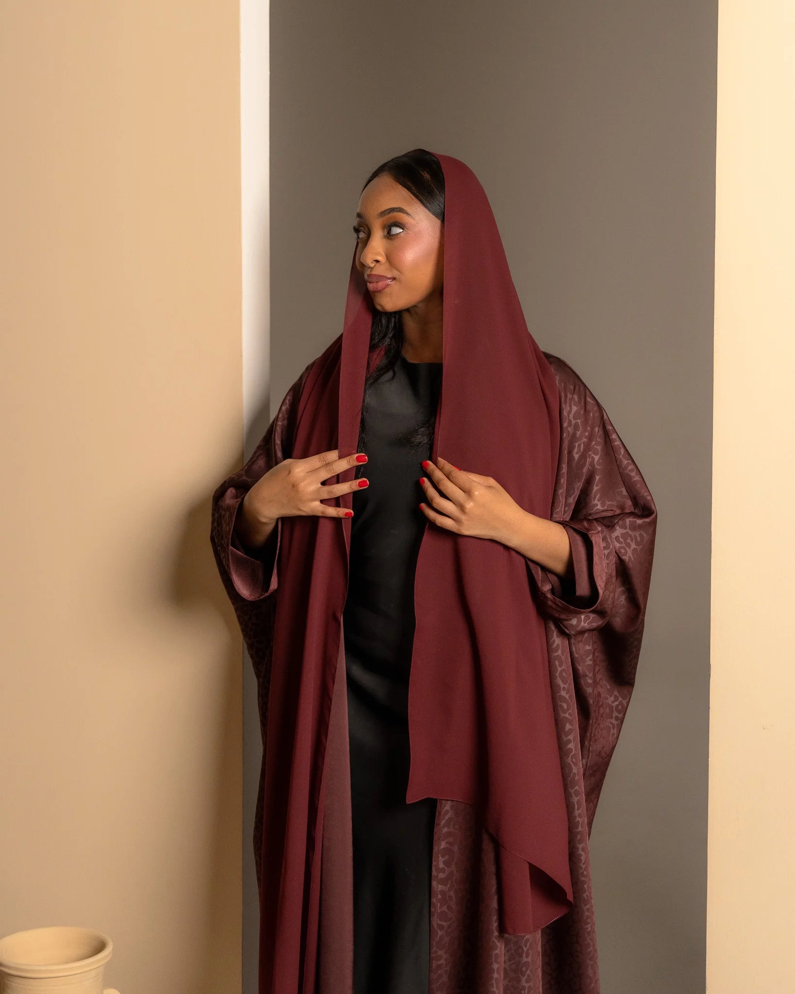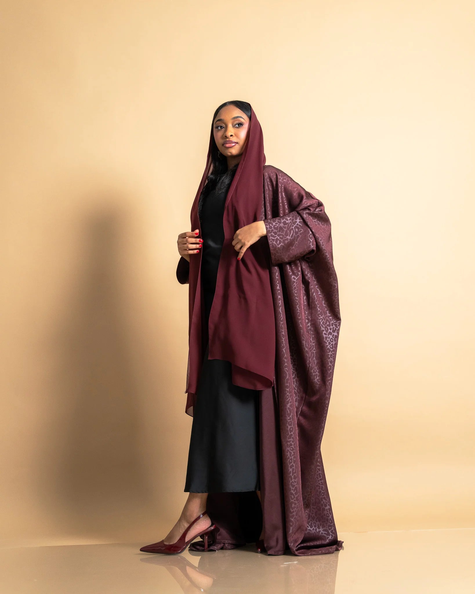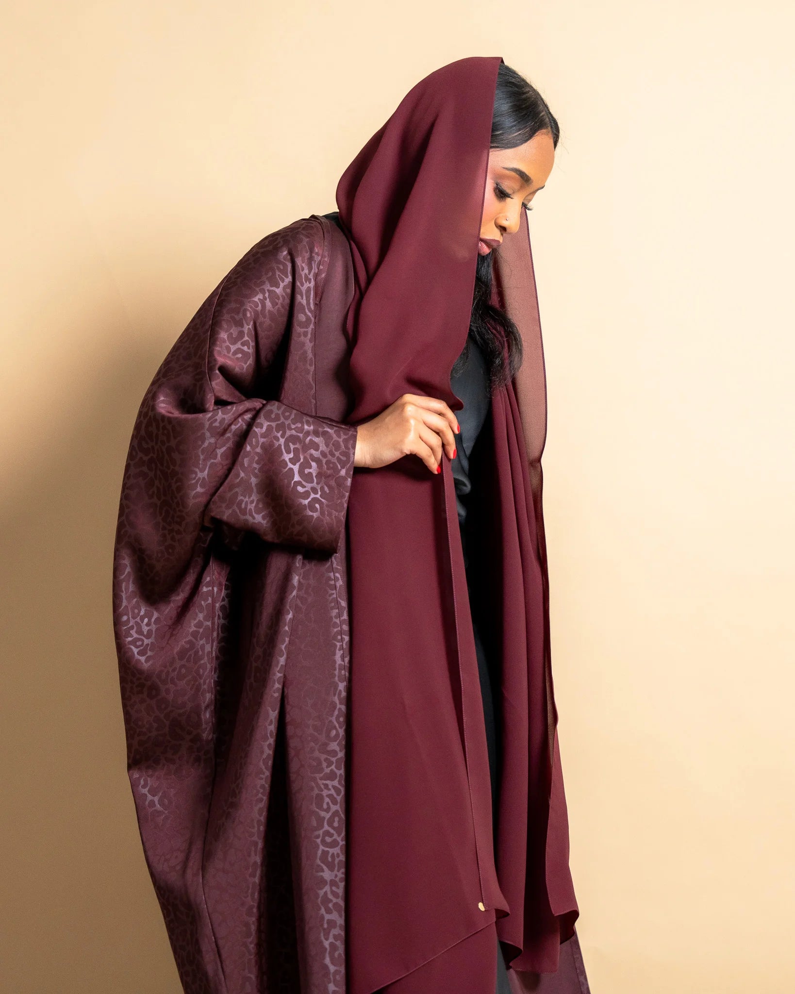Command attention with the Leopard Red Satin Abaya – where power meets sophistication.