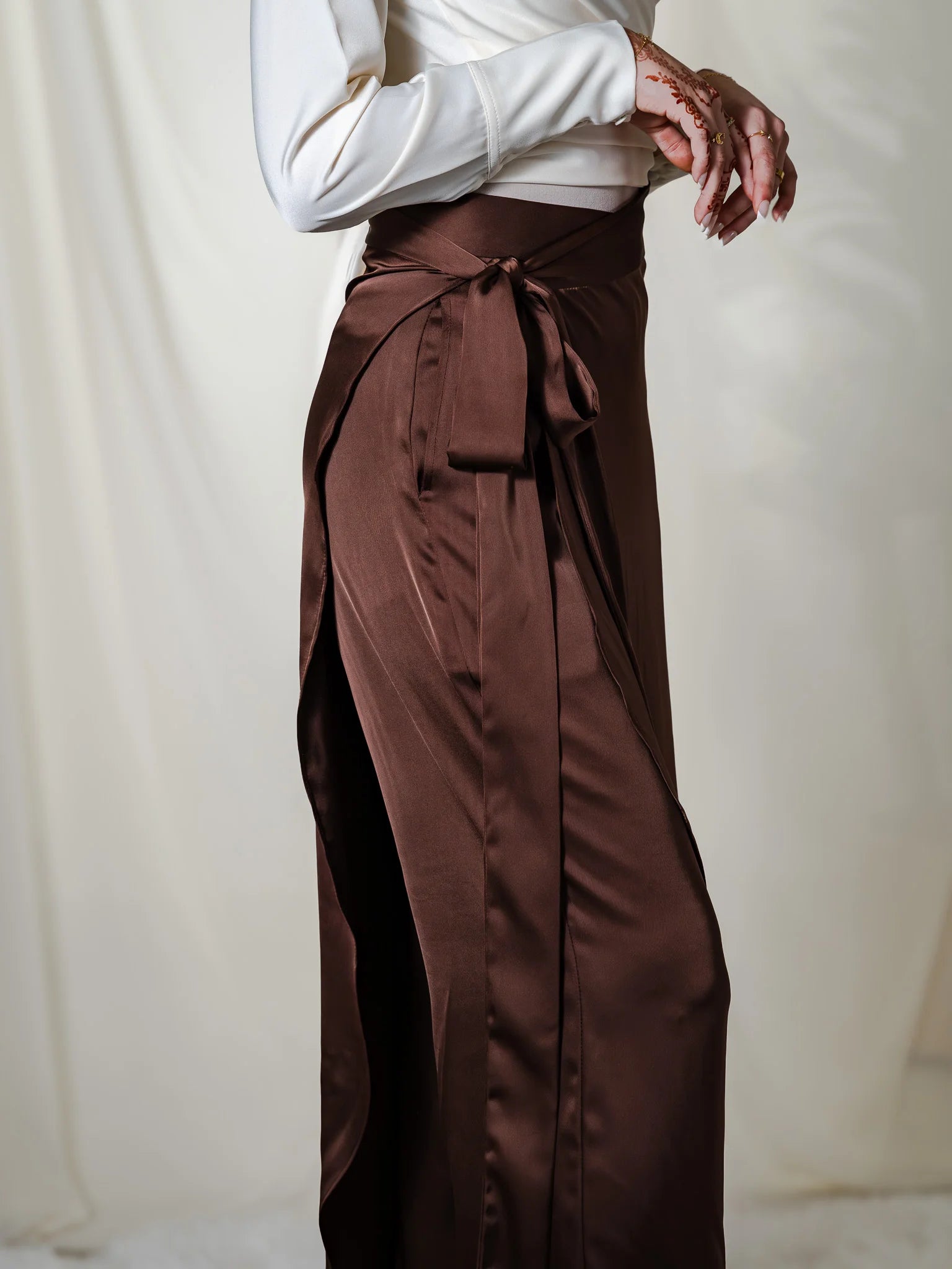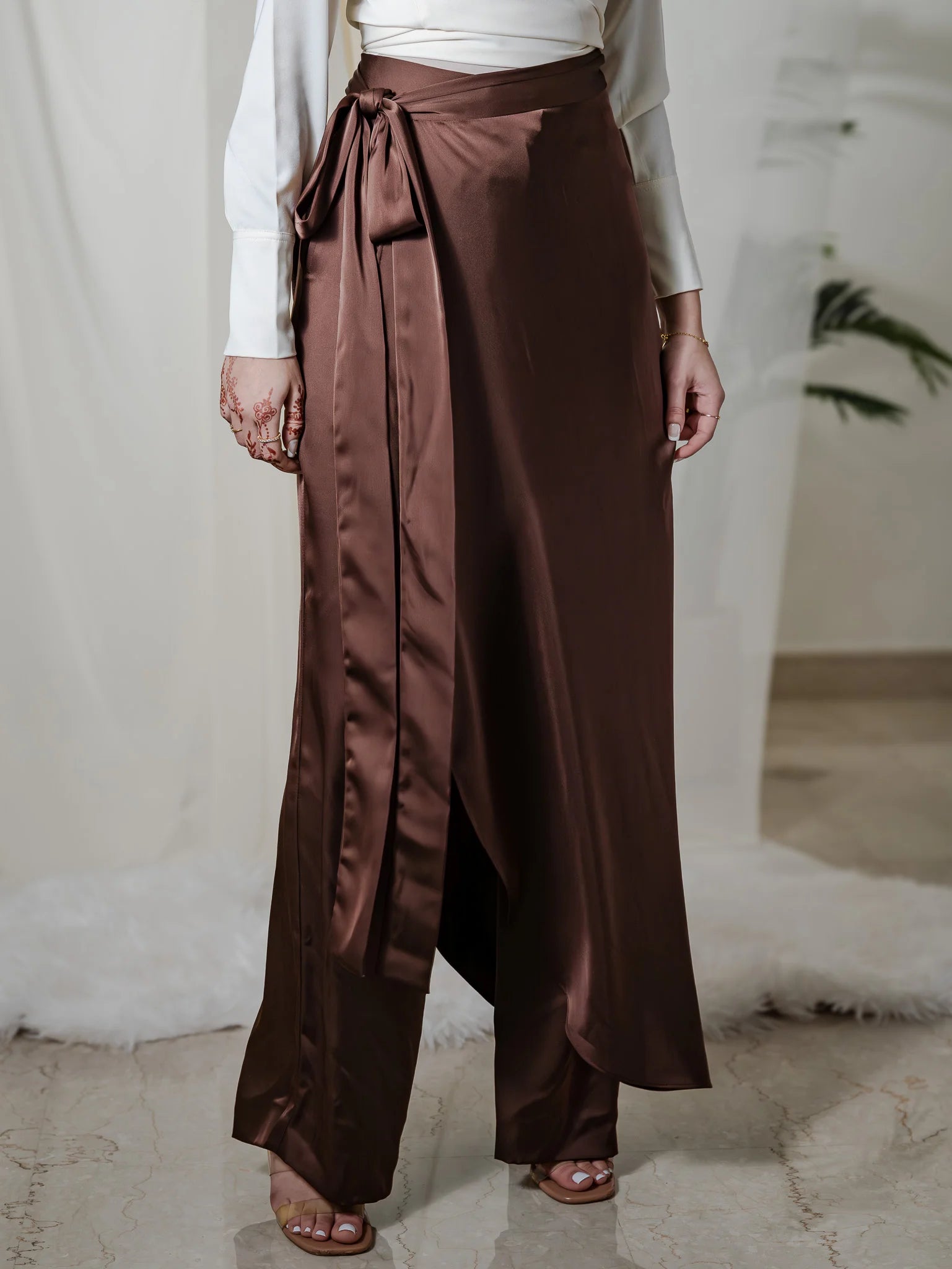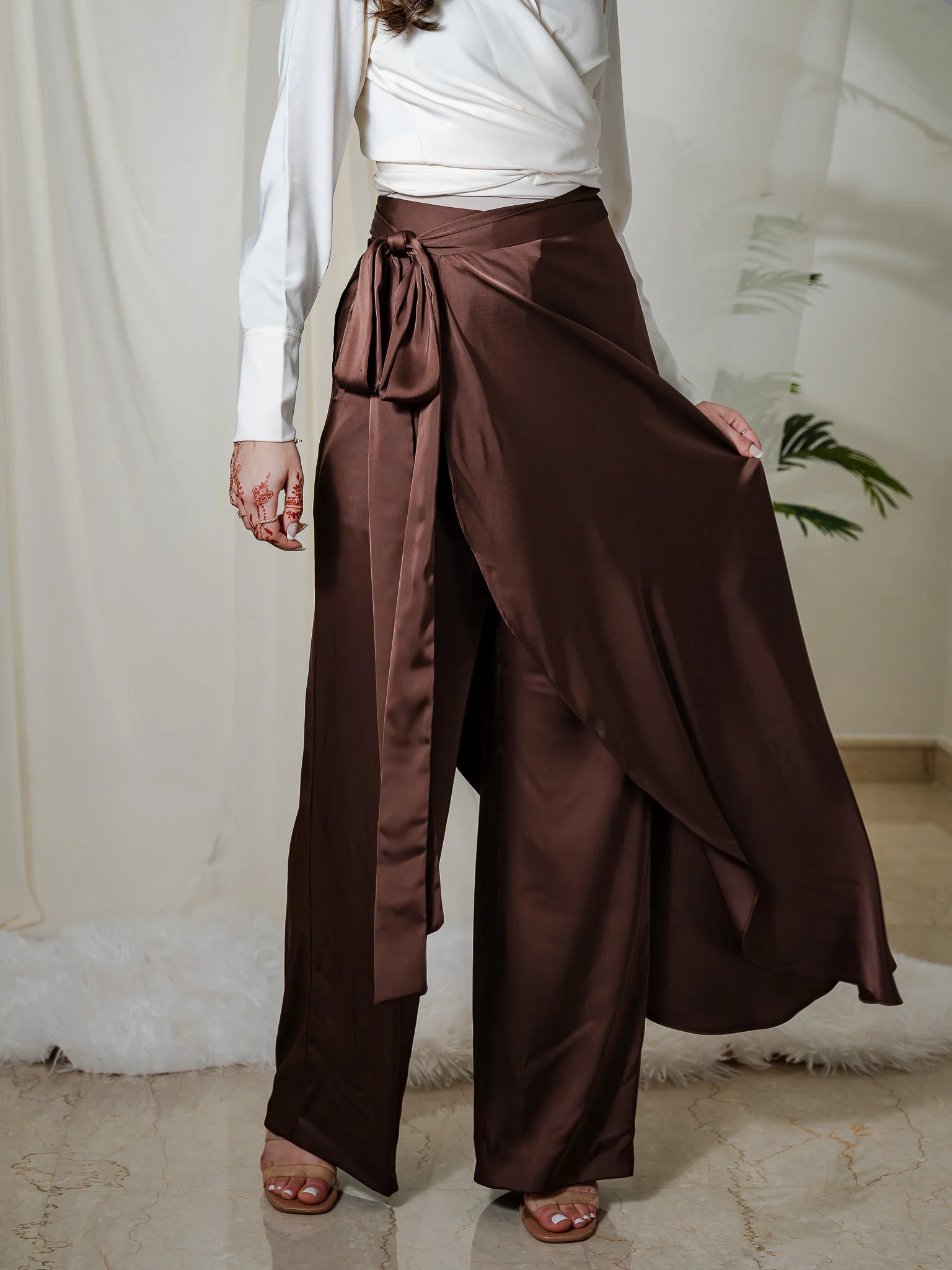 - Introducing our Swaddle Silky Pants – a captivating satin wide-leg pants with a half-wrap skirt overlay, creating a stunning illusion of a skirt. Crafted from luxurious satin, these pants offer both elegance and comfort, ensuring you feel effortlessly chic with every wear.