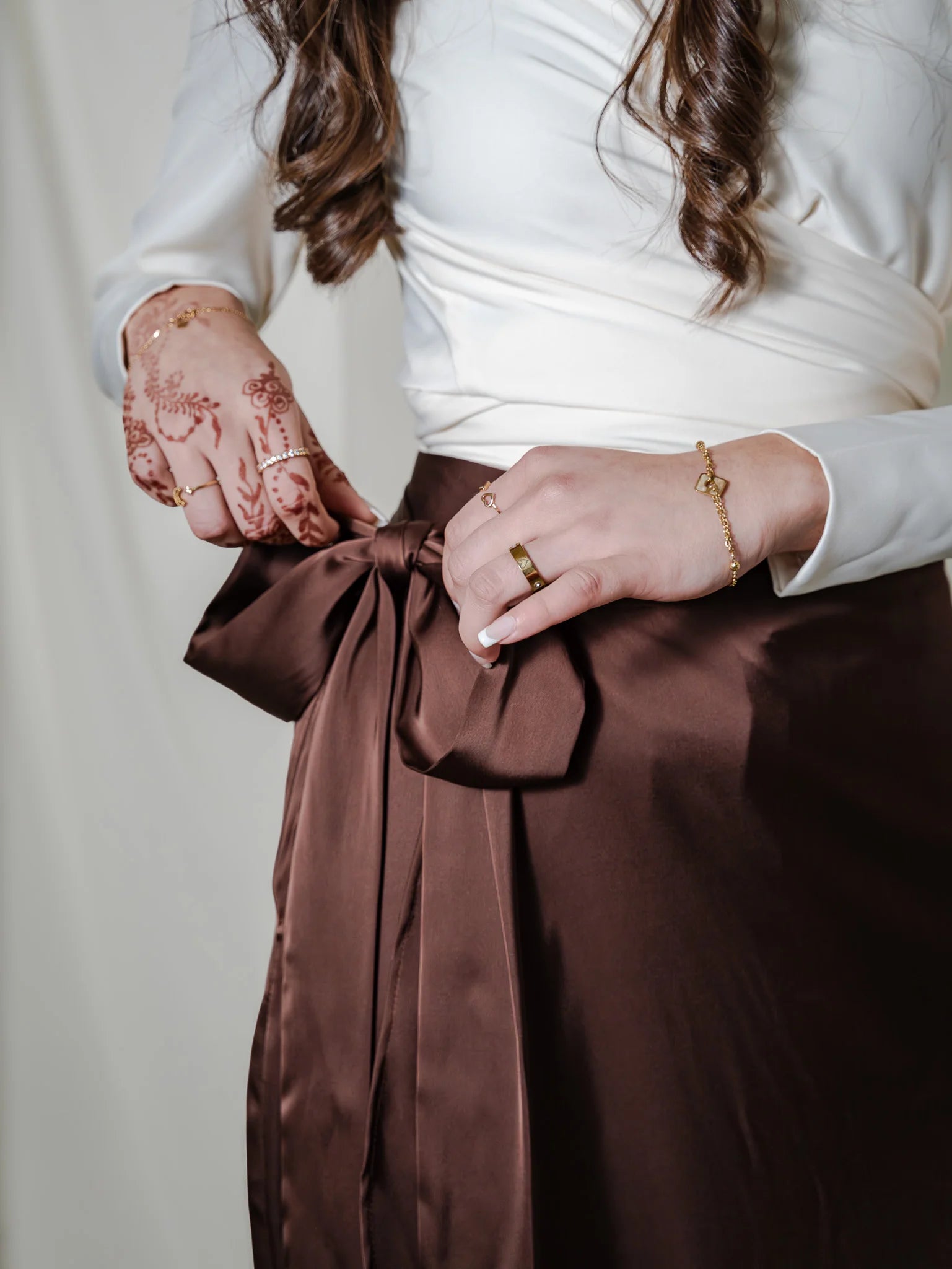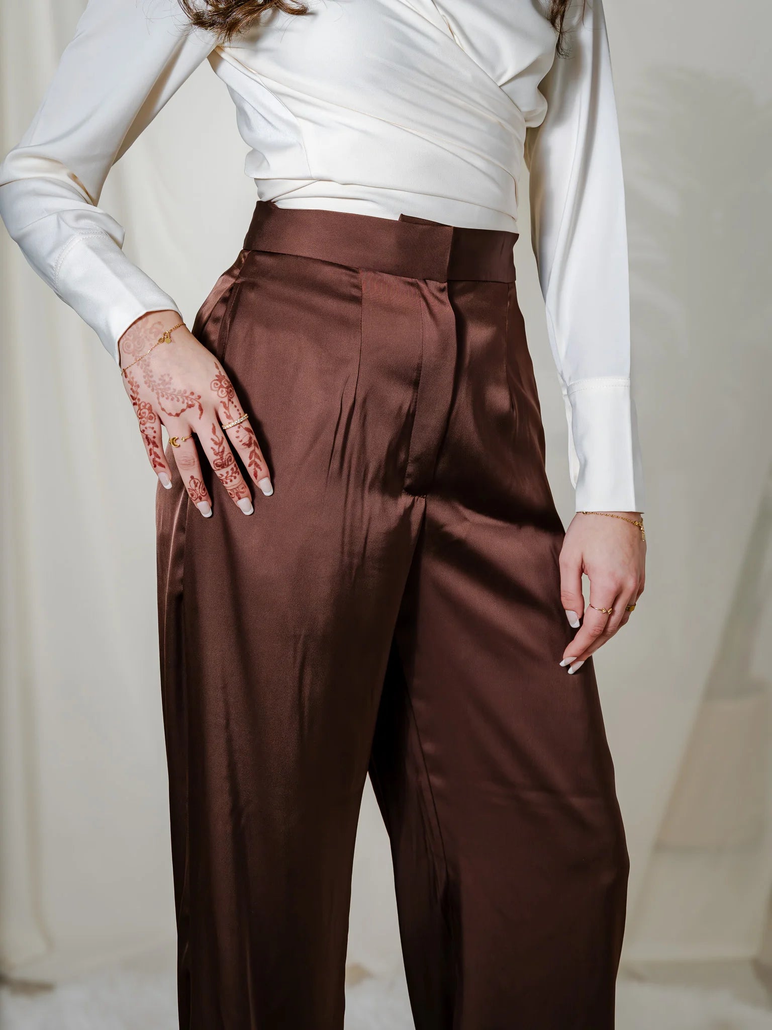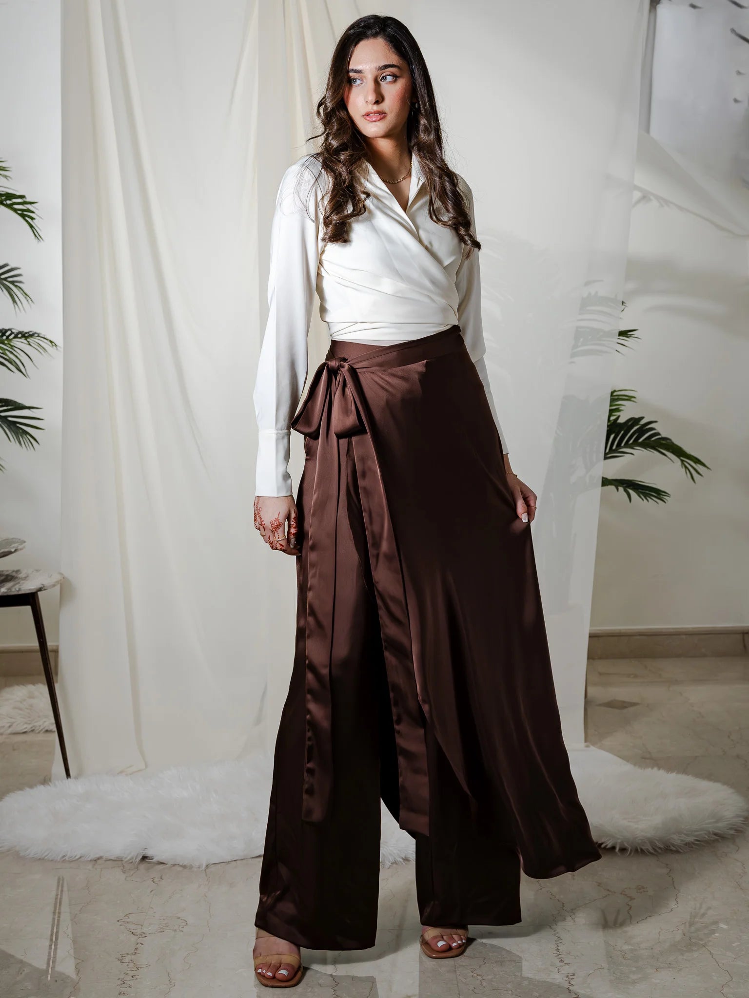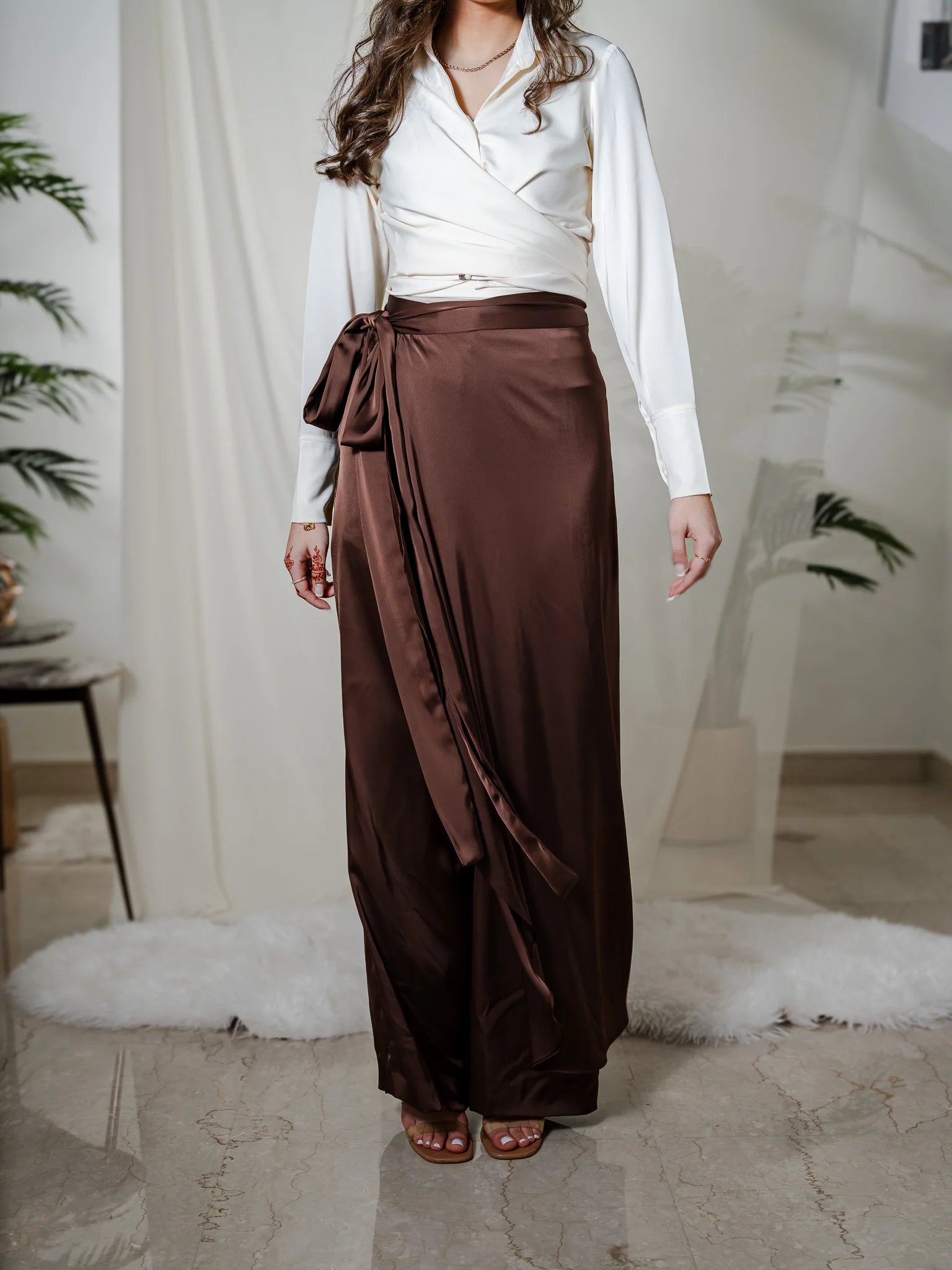 - Introducing our Swaddle Silky Pants – a captivating satin wide-leg pants with a half-wrap skirt overlay, creating a stunning illusion of a skirt. Crafted from luxurious satin, these pants offer both elegance and comfort, ensuring you feel effortlessly chic with every wear.
