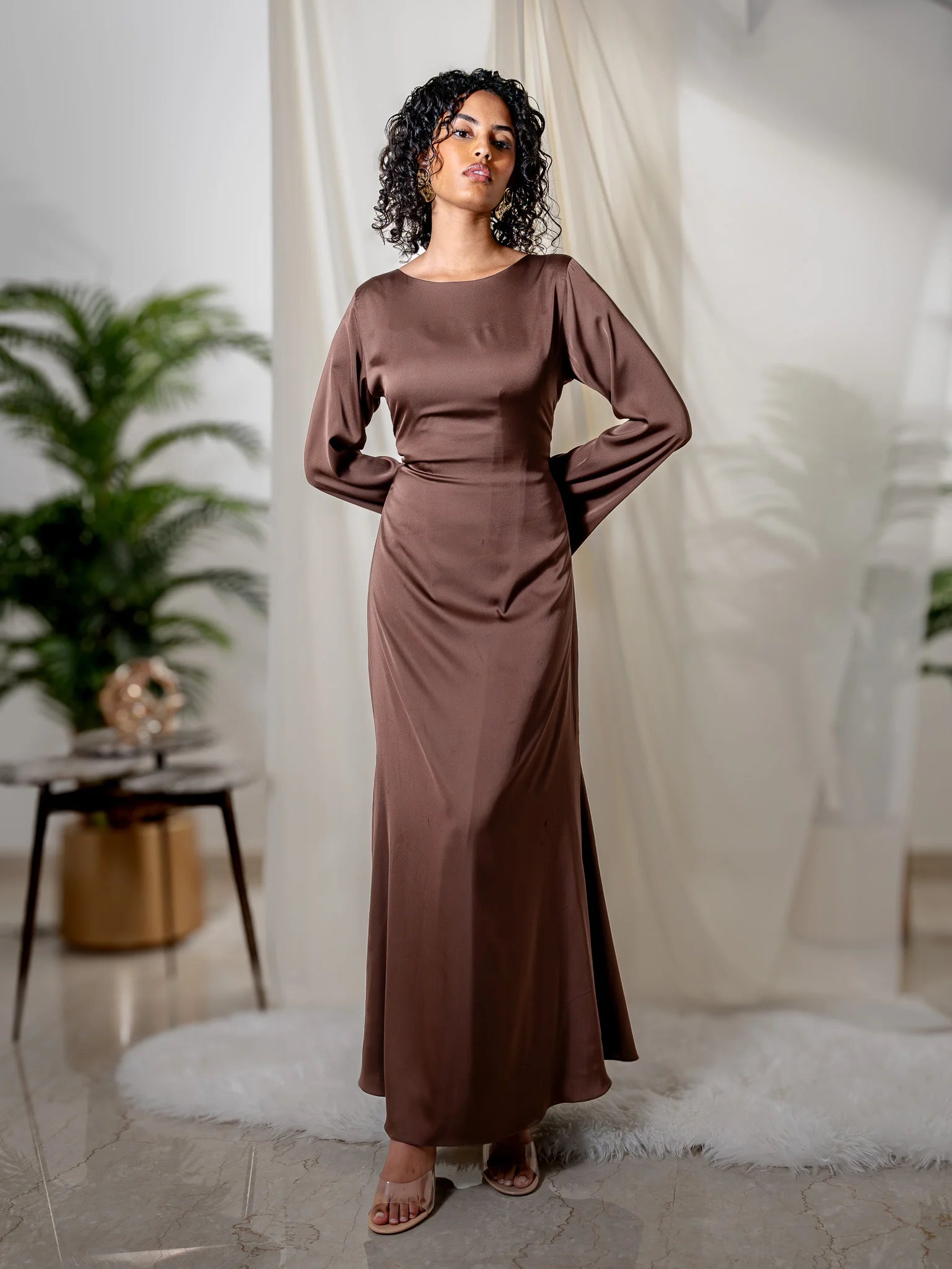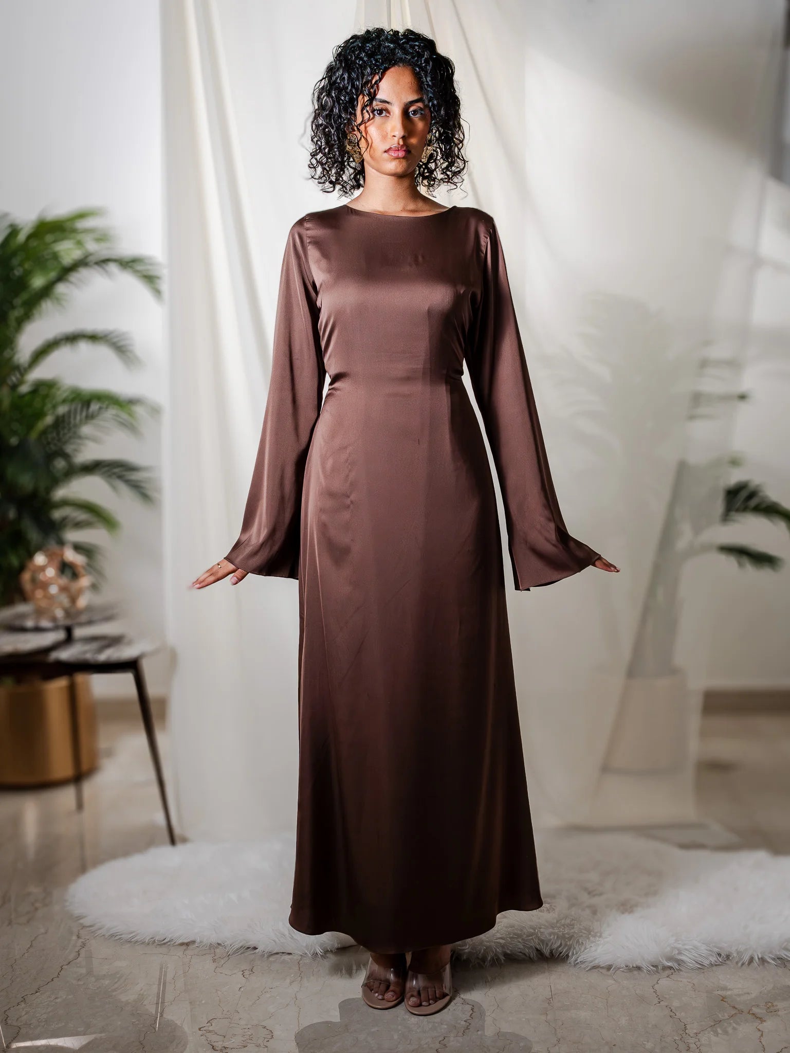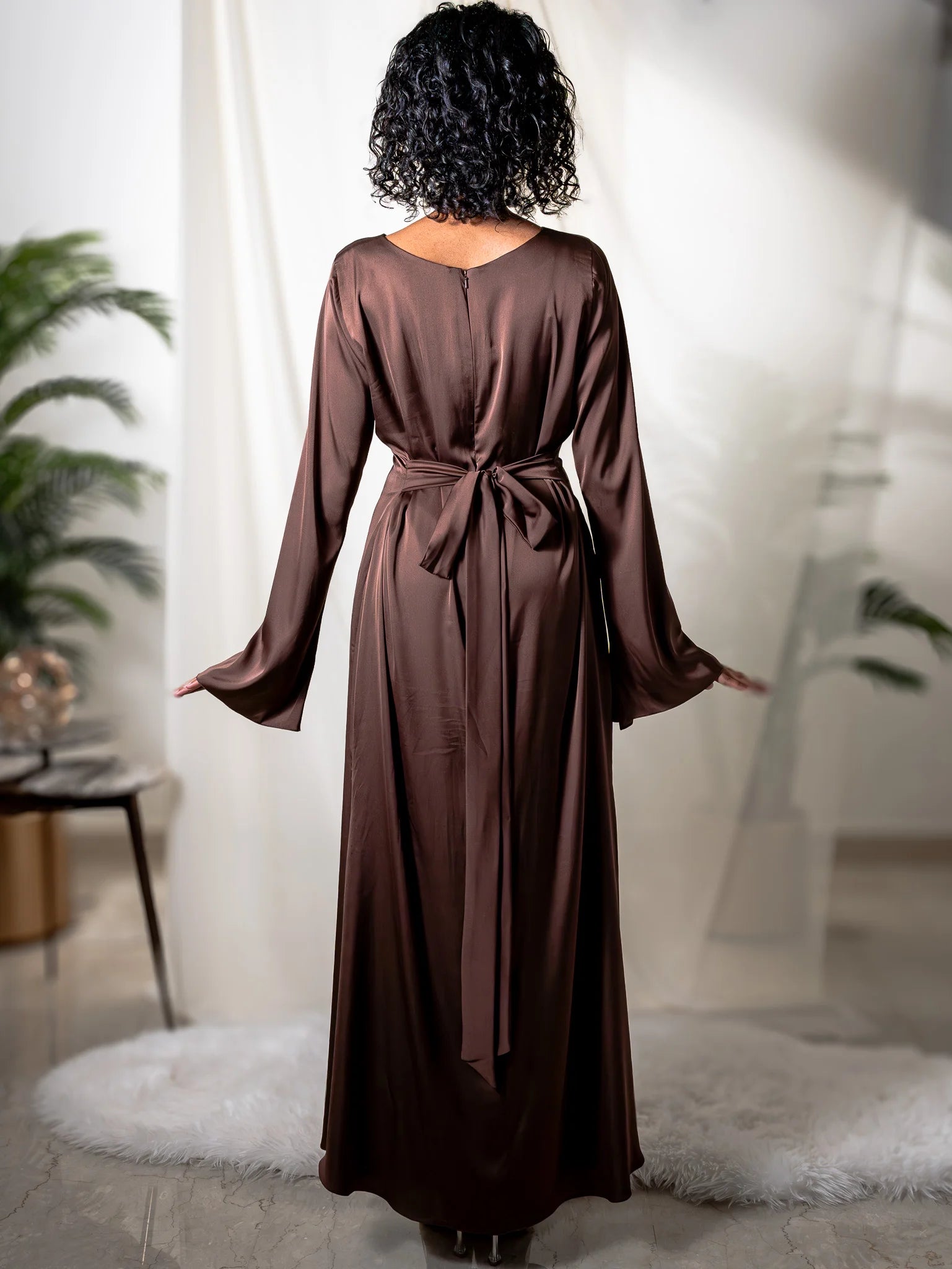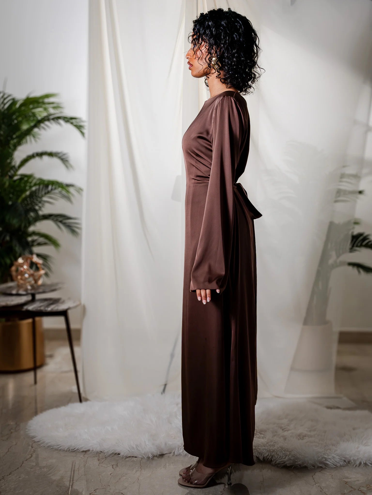 - Introducing the Turabiyya Hareer Dress, a luxurious addition to your closet. This enchanting dress features long sleeves with attention to detail. The back has a tie, allowing for a customizable and perfect fit tailored to your silhouette.