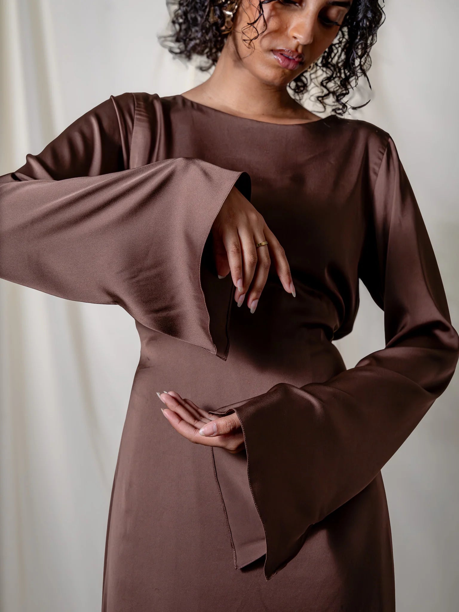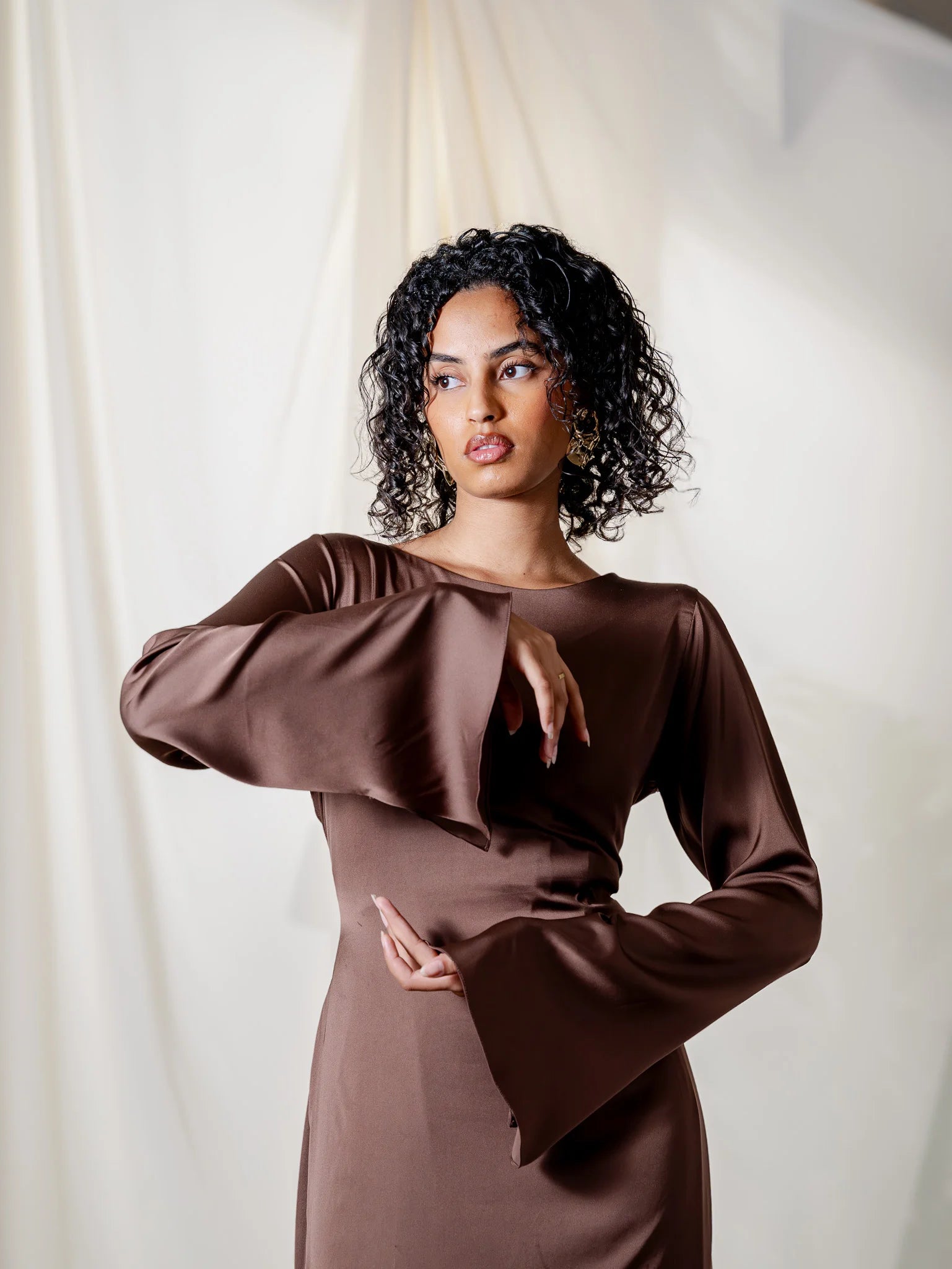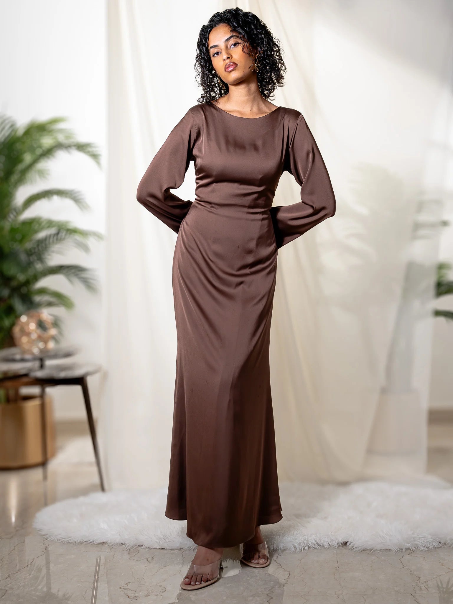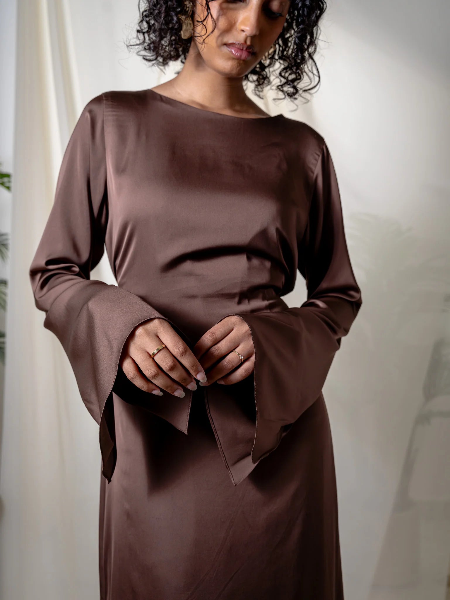 - Introducing the Turabiyya Hareer Dress, a luxurious addition to your closet. This enchanting dress features long sleeves with attention to detail. The back has a tie, allowing for a customizable and perfect fit tailored to your silhouette.